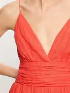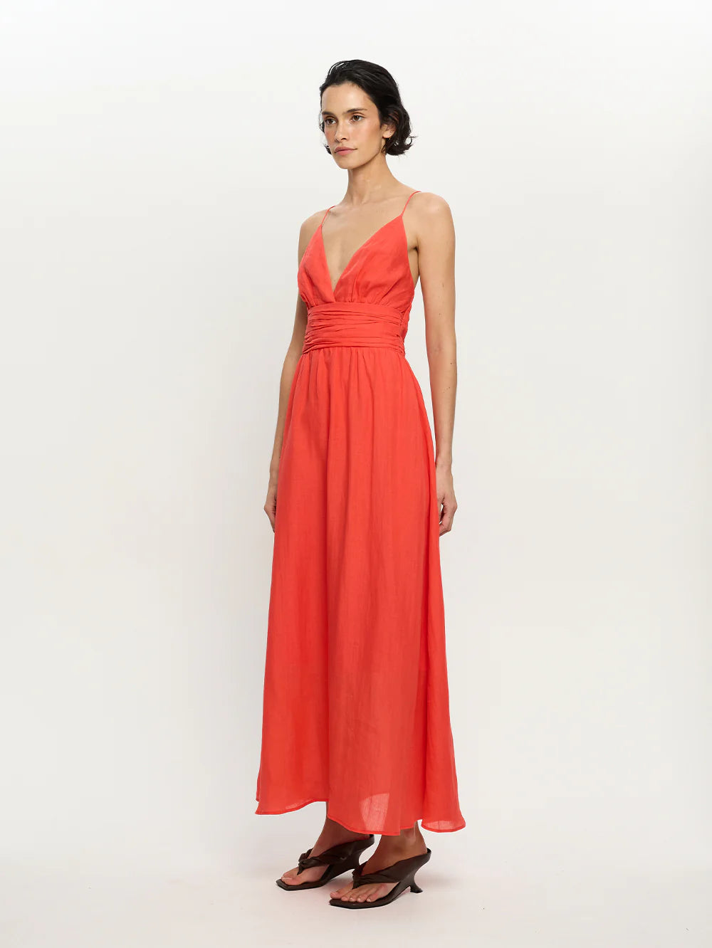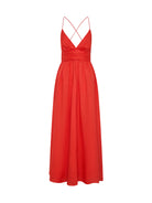 The Nala Strappy Maxi Dress in red features a V-neckline, thin straps and a lace-up back for adjustable shape. A gathered waistband defines the silhouette, falling into a full-length maxi skirt that moves with ease. Designed for warm, sun-filled days and effortless occasions. Style with sandals for daytime celebrations or elevate with heels for evening events and summer nights out.