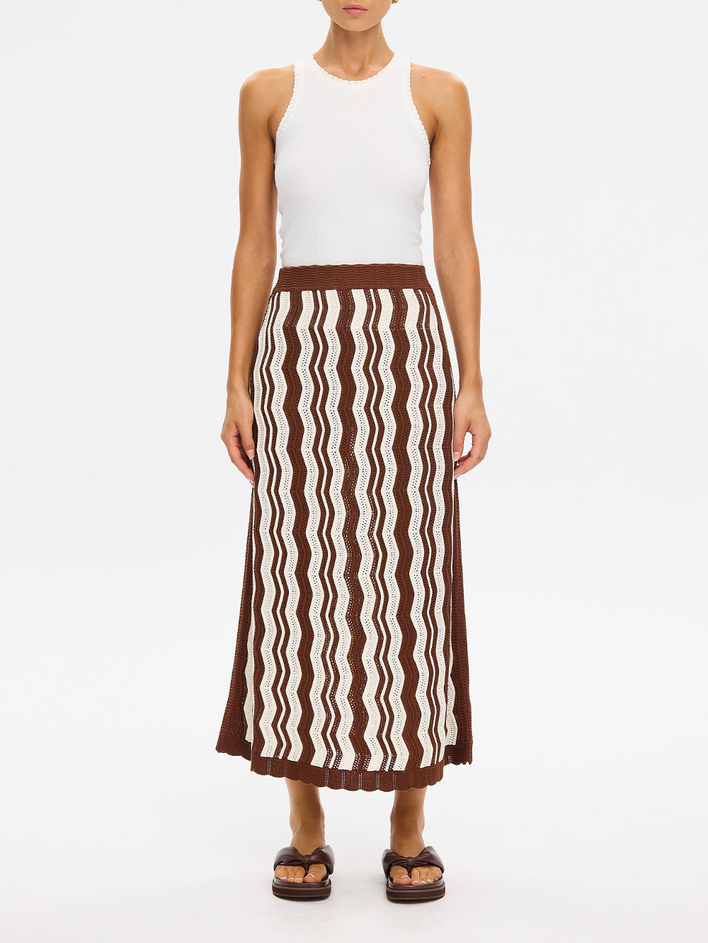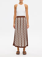 The Sarah Knit Midi Skirt is designed with a pointelle wave stitch and scalloped hem, finished with an elasticated waistband for everyday comfort. An effortless piece for warm-weather wear. Style with the matching Sarah Knit Top for a coordinated look, or pair with a simple tank for an effortless look.