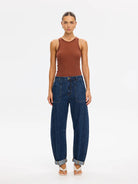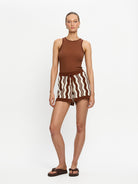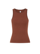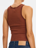 A modern essential, our signature Tallulah Tank Top in chocolate is cut from a premium rib knit featuring a high neckline accented with hand-crocheted detailing adding an artisanal touch. Wear with denim or linen separates for easy daytime dressing, or elevate with tailored pants and sandals for a refined, minimalist look.