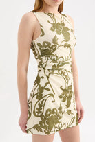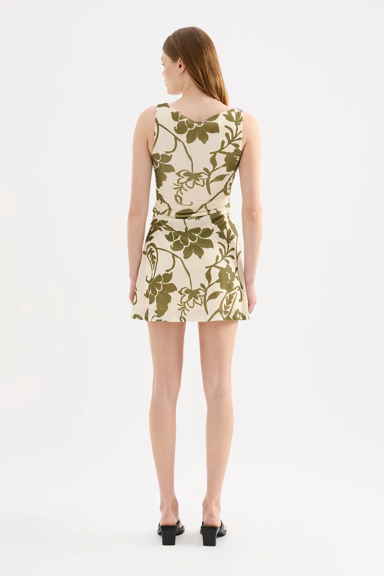 The Dahlia Mesh Mini Dress is made from a stretch jersey in our exclusive Dahlia print. The silhouette is fitted through the body, with a slight A-line shape at hem and mini in length. Features include a wide boat neckline and soft gathering through the waist. This dress is fully lined.