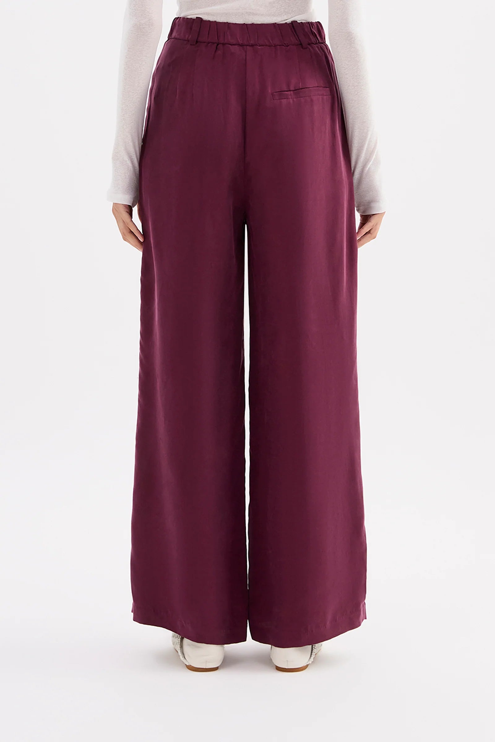 The Lea Cupro Pant is designed with a soft, sueded hand feel fabrication from our signature premium cupro. This cupro pant fits high rise on the waist and is wide leg. Features include front pleats, double belt loop detail, concealed button and trouser hook closure and is elasticated at back waistband.