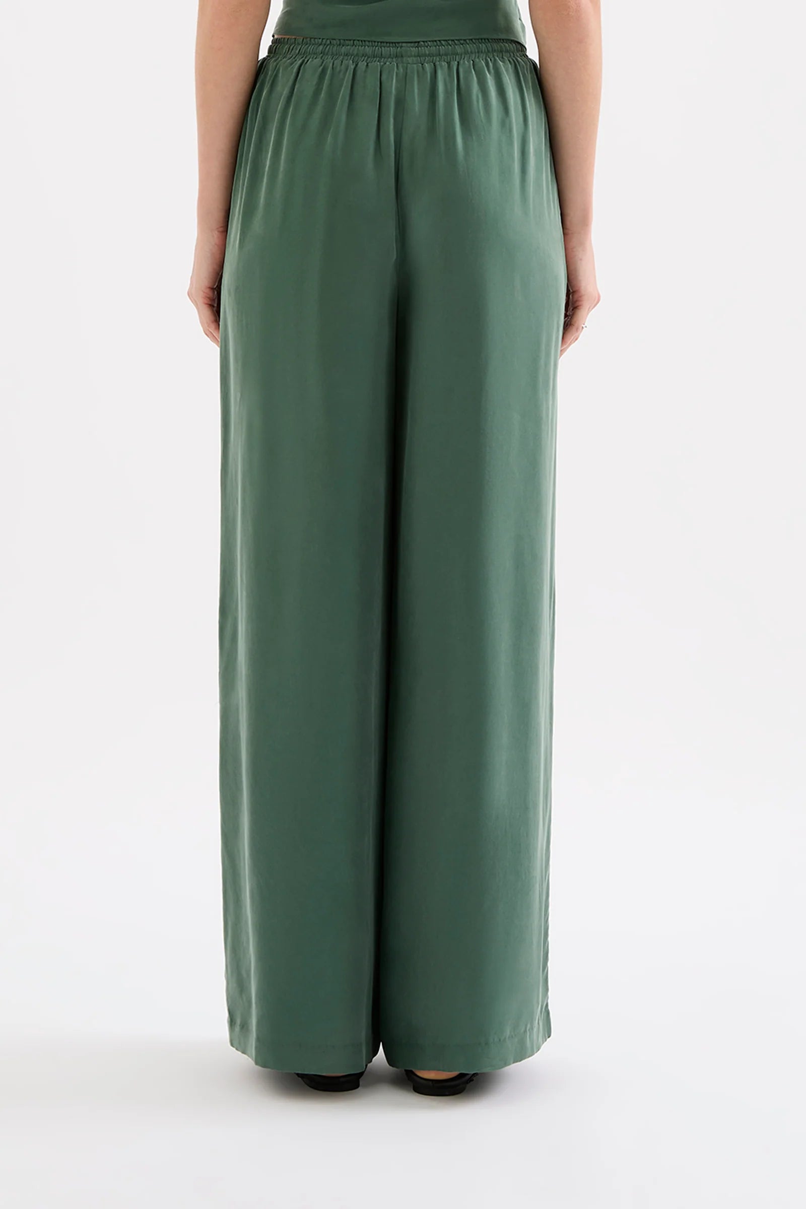 The Leon Cupro Pant is made in our signature premium cupro fabrication which has a soft, sueded hand feel. This pant has a relaxed, wide leg silhouette and features an elastic waistband, drawstring and side seam pockets.