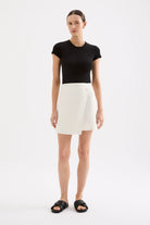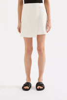 The Thilda Linen Mini Skirt in white is made from 100% linen which has been washed for a soft, breathable hand feel. The silhouette is high waisted and mini in length. Features include mock wrap front panel, mock shell button and invisible zipper at back. This skirt is fully lined.