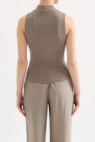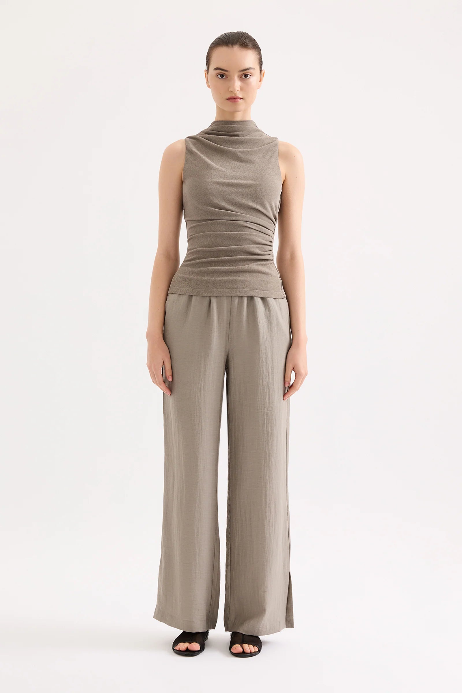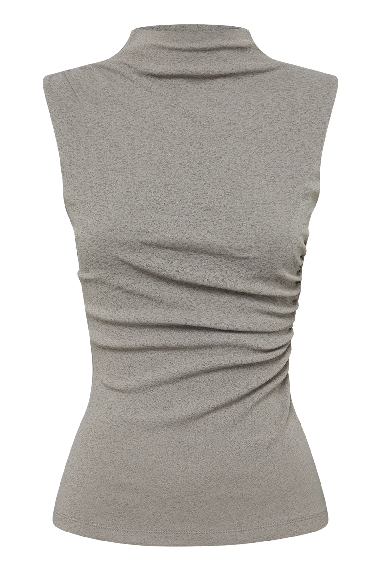 The Winston Mesh Top is made from a stretch jersey with a dry hand feel. The silhouette is a form fitting tank with length finishing at the hip. Features include a raised neckline with soft gathering detail, and asymmetric draped gathering across the body. This top is fully lined.