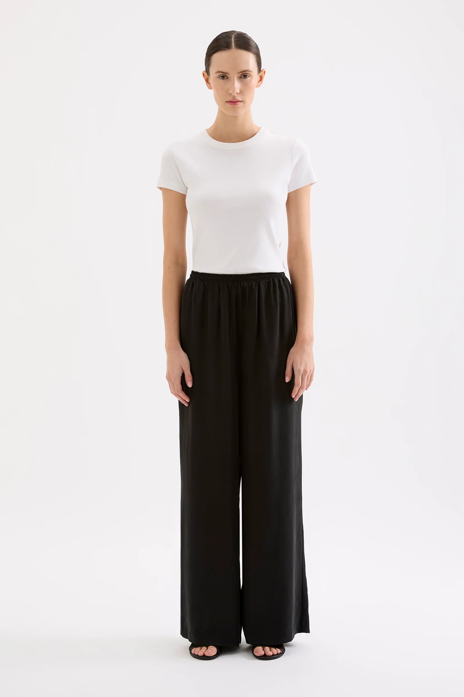 The Dara Cupro Pant in pickle is made in our signature cupro fabrication which has a soft, sueded hand feel. The silhouette is a relaxed wide leg, full length pant. Features include an elasticated waistband, side seam pockets and slits at hem.