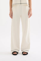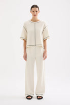 The Sutton Pant is made from a textured cotton/linen blend fabric that is soft on the skin. The silhouette is a relaxed fit, high waisted, full length pant. Features include an elasticated waistband, contrast stitch detail, splits at hem and side welt pockets.
