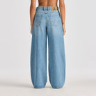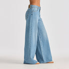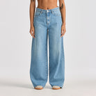 Designed to sit relaxed, and dropping to a dramatic wide leg silhouette the Mid Stevie stacks on your shoes for a true vintage flare look. Crafted in a vintage inspired light indigo wash, in a soft non-stretch denim with an authentic vintage texture that gets more unique with every wash.