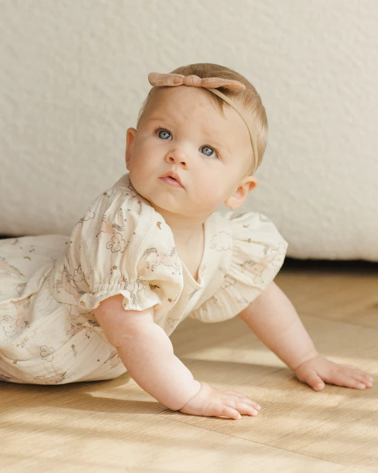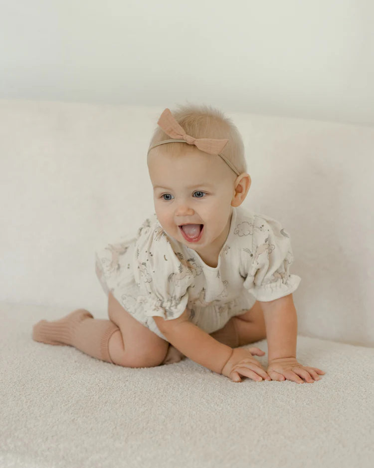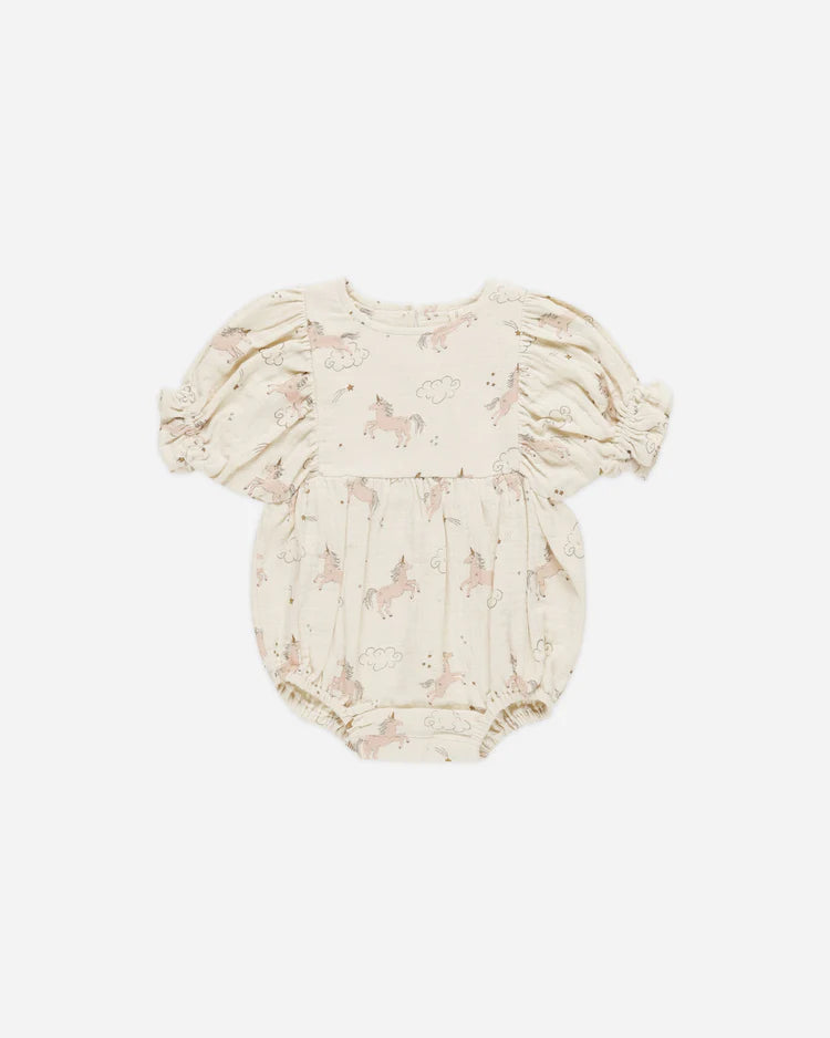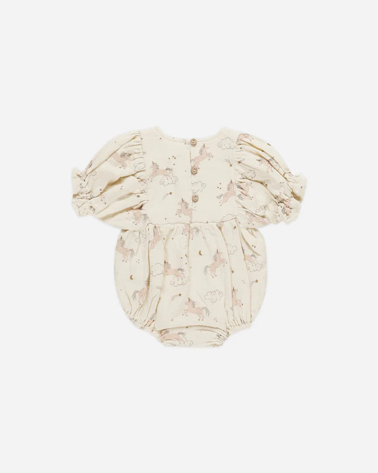 The Cosette Romper is created with a lightweight cotton gauze making it the perfect layerable outfit to transition into cold weather. Oversized and gathered balloon sleeves, elastic ruffle trim, gathered waist, and hidden snaps add all the perfect details.