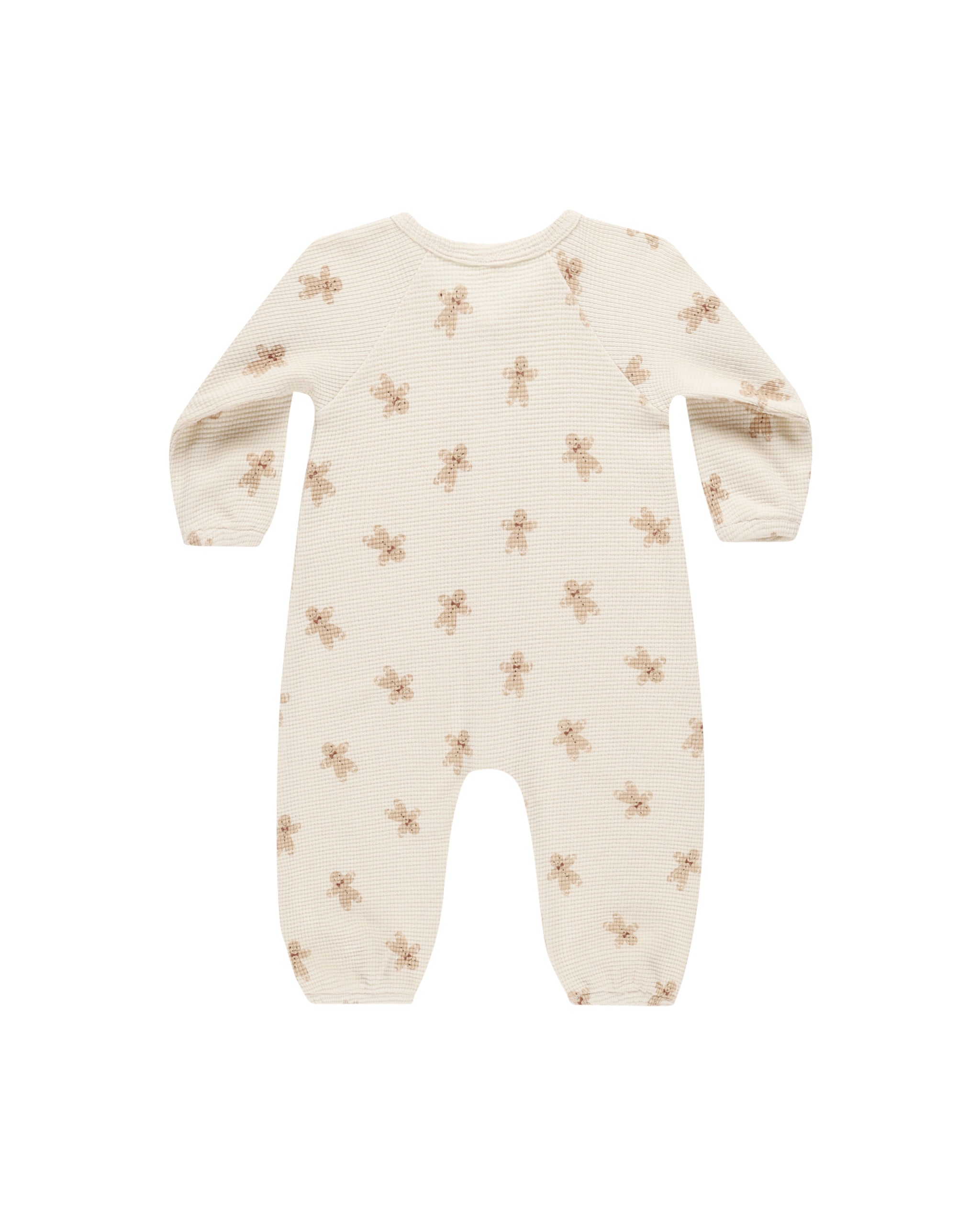 Raglan waffle longsleeve jumpsuit featuring coconut buttons down the chest and elastic leg and sleeve openings.