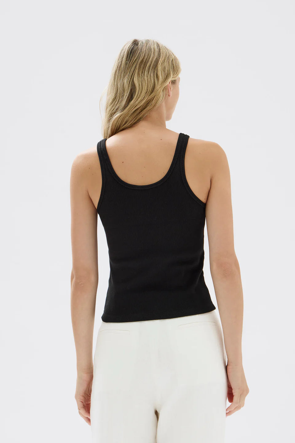 Rib scoop neck signature tank. Finished with external bind, with double scoop neckline.