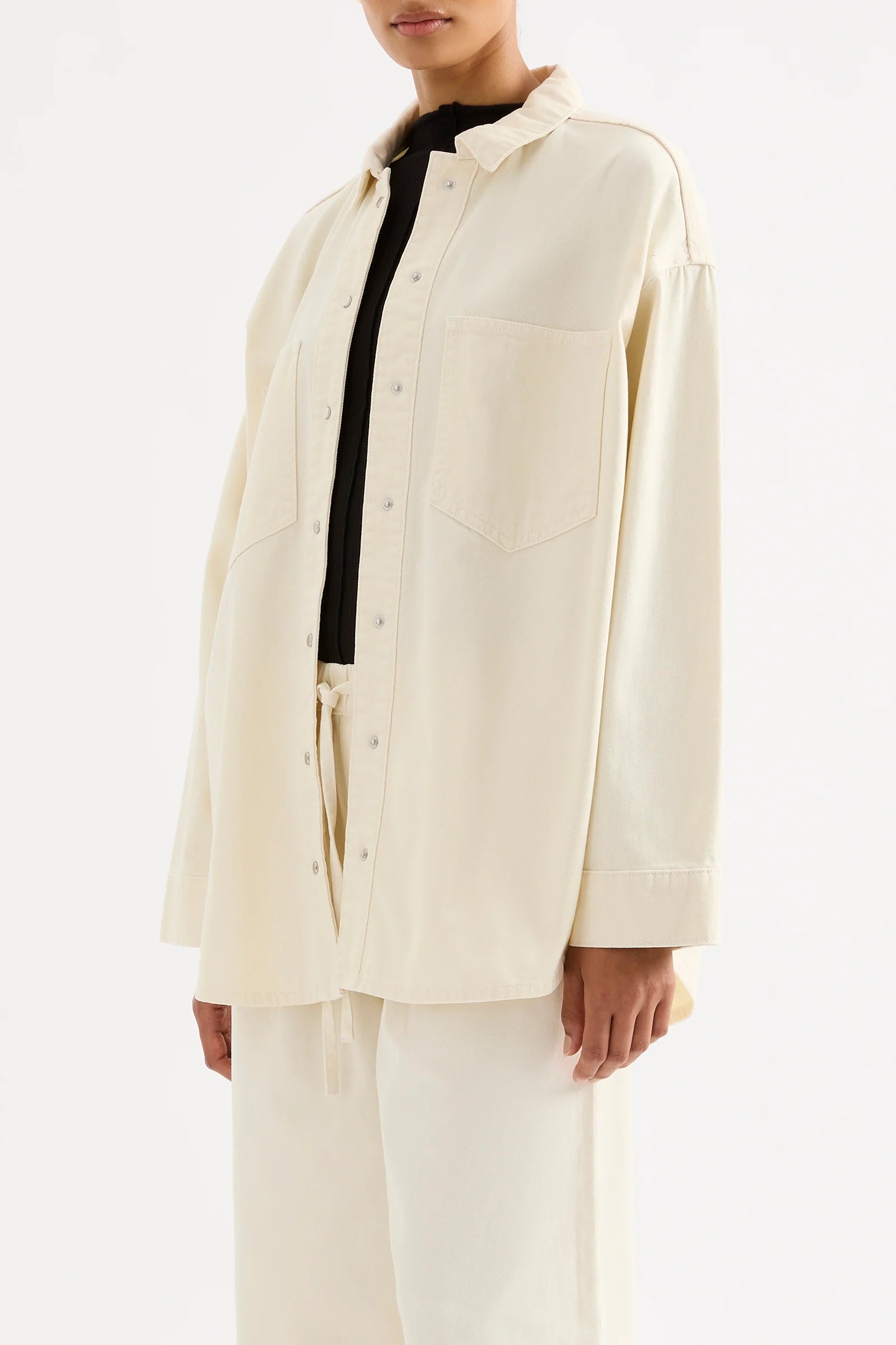 The Esme Denim Overshirt is made from 8 oz 100% organic cotton denim, wih an authentic stone wash in natural. The silhouette is oversized with a drop shoulder and length finishing below the hips. Features include front patch pockets & press stud buttons through centre and sleeve cuff.