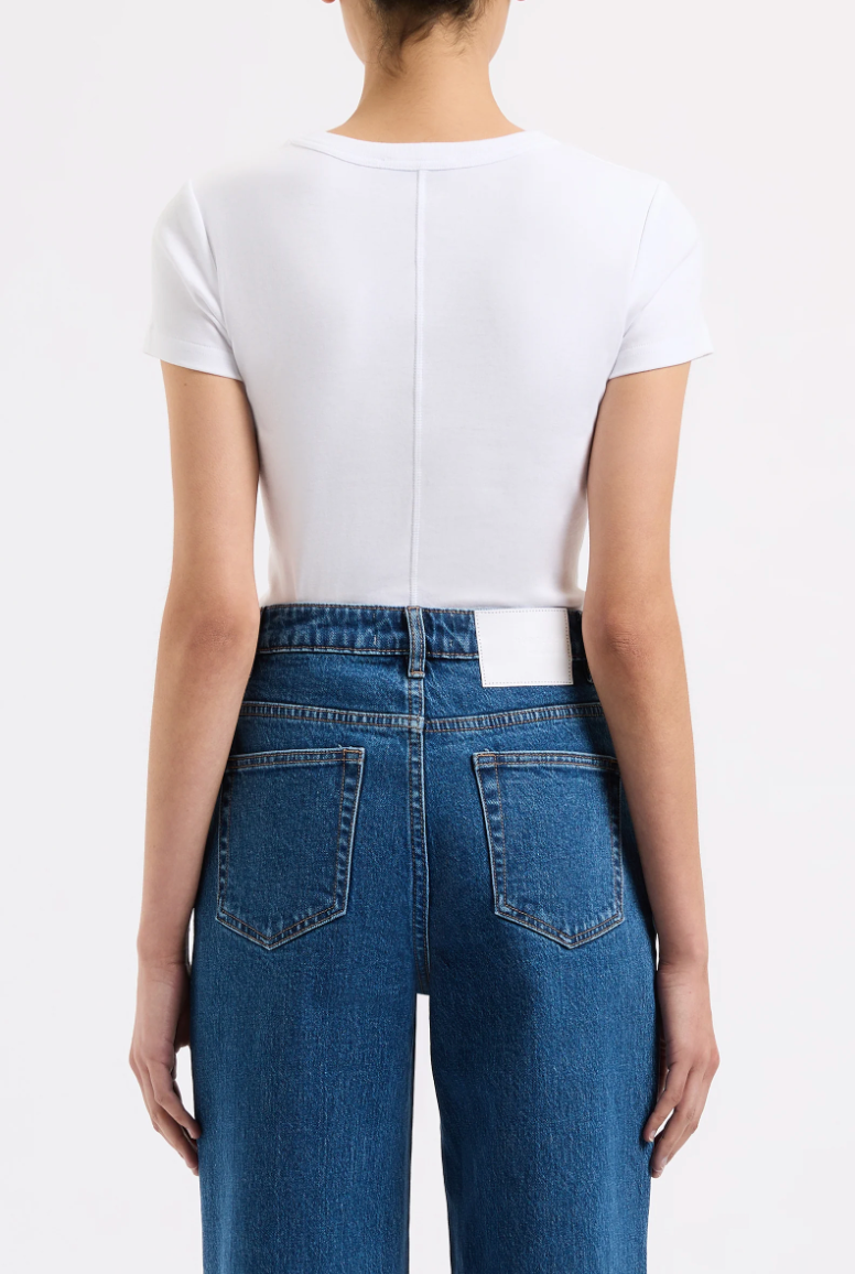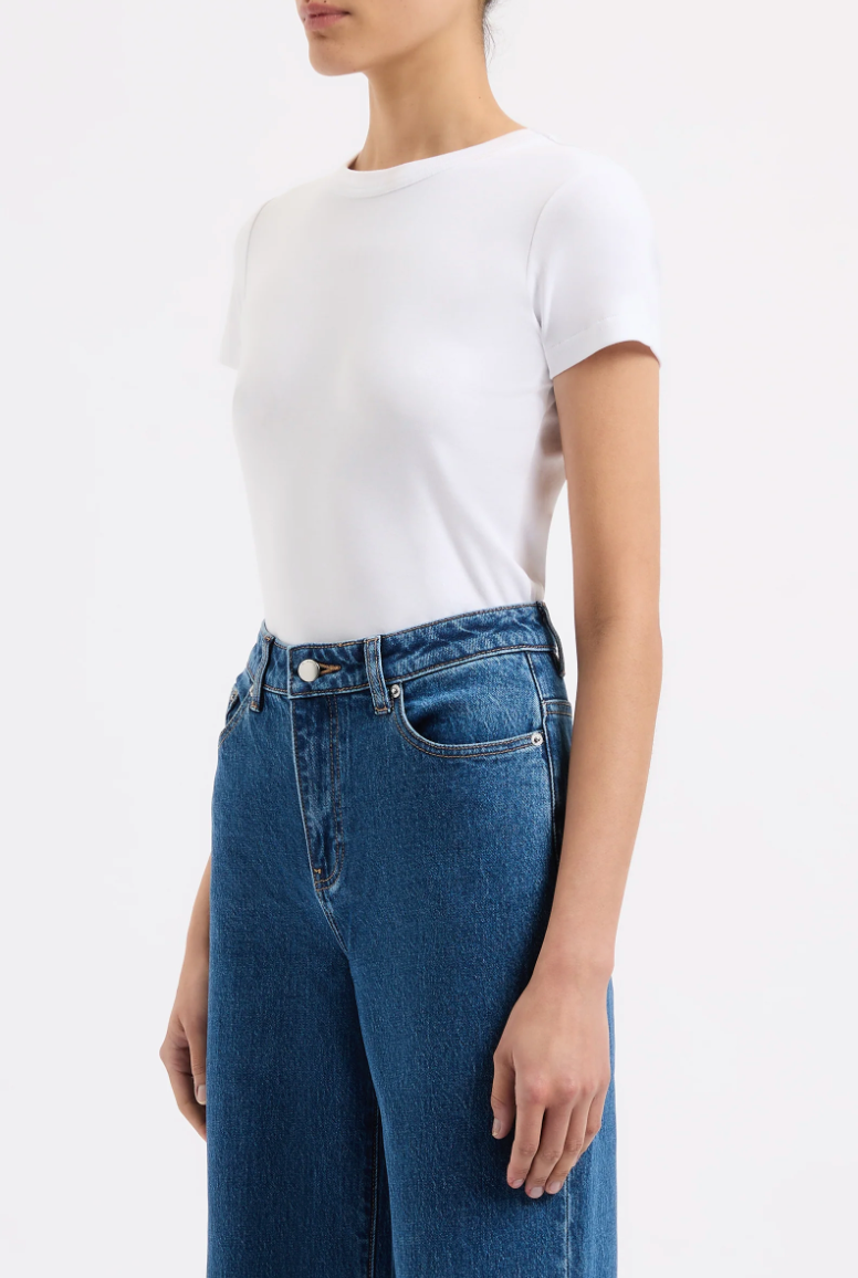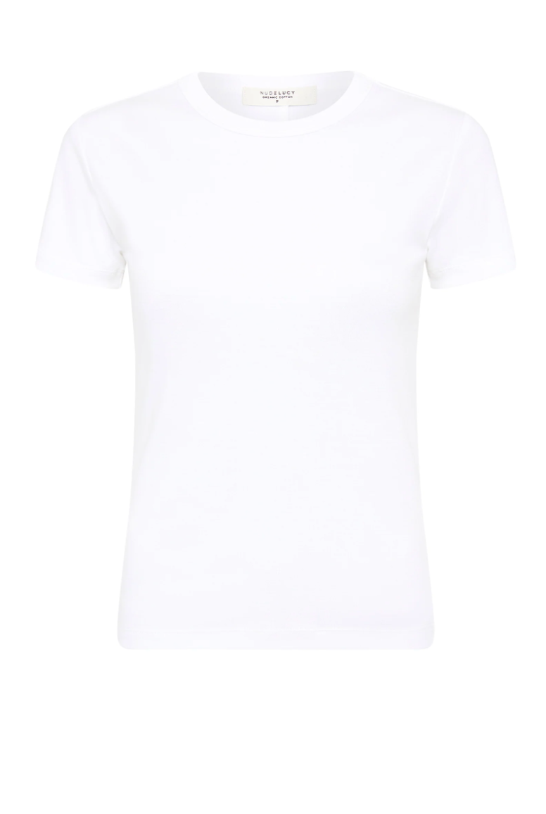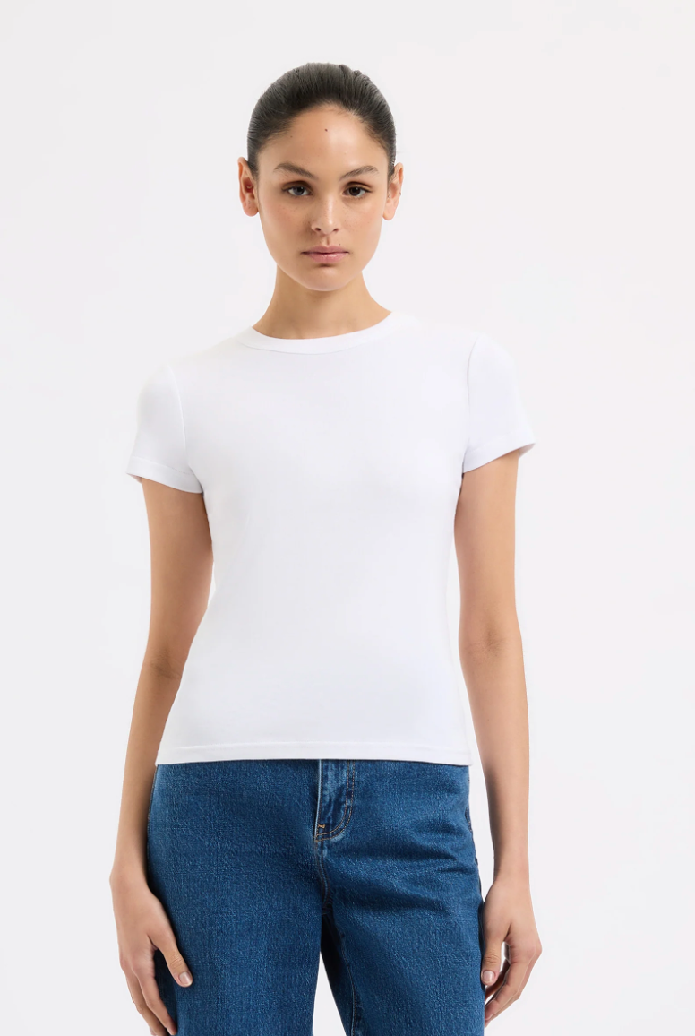 The Organic Baby Tee is made from a lightweight organic cotton jersey, which has a soft, breathable hand feel. The silhouette is a flattering close fit and finishes at the hips. Features include a crew neck, and short, fitted sleeves. This can be tucked in or worn over midrise bottoms.