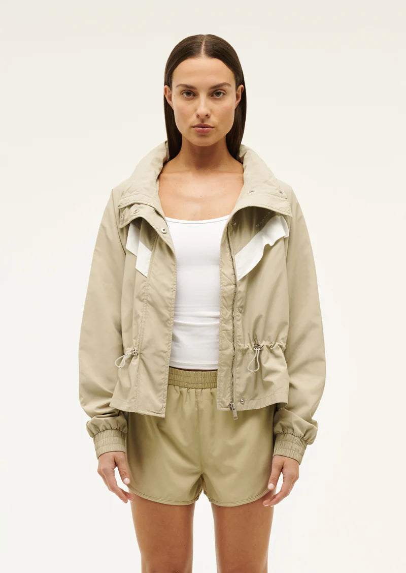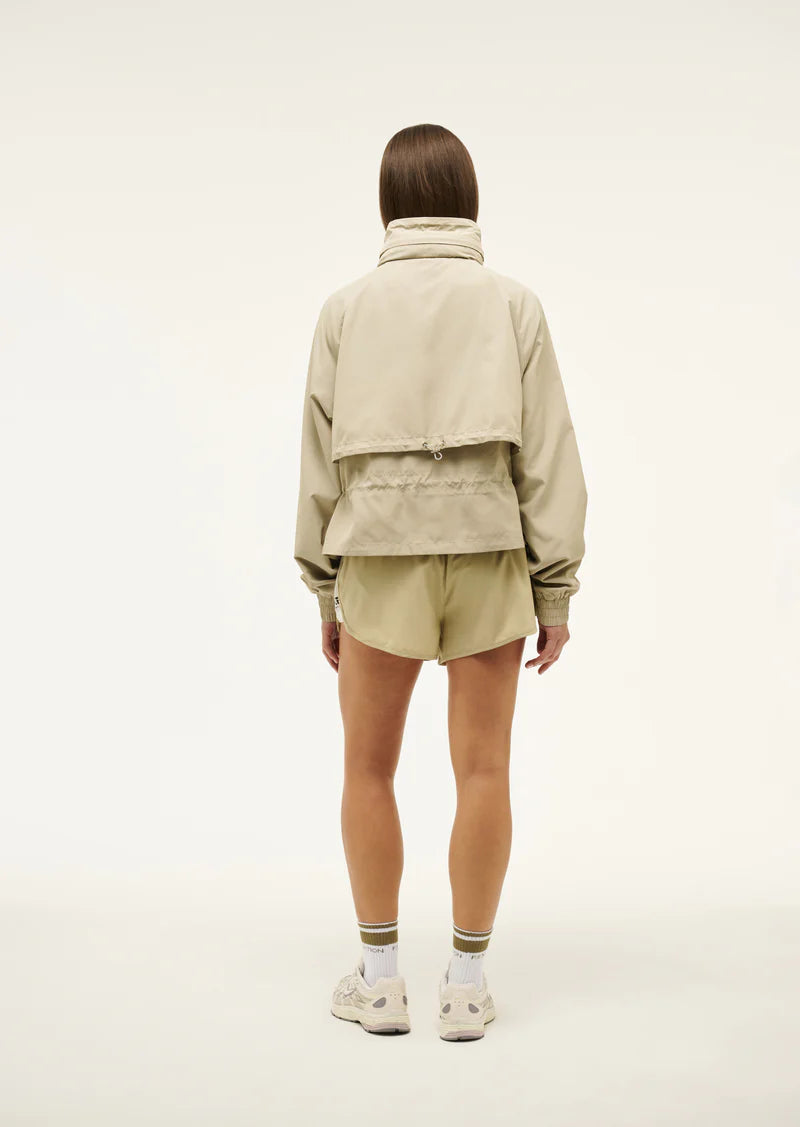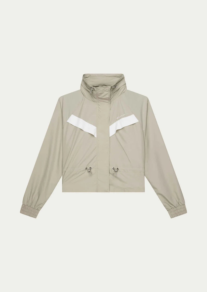 The Shelter Jacket in Overcast comes as part of our REC CLUB Collection. Designed in our signature water resistant spray fabric, this cropped jacket features contrast chevron panelling, a hidden chest pocket, an elasticated drawcord waist and a packable hood. Wear your jacket over activewear or pair with our Award Spray Pant or favourite legging for an elevated athleisure look.