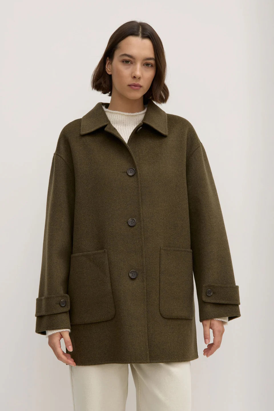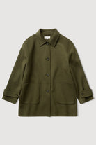 Cropped length coat crafted from 100% wool. Features large patch pockets and sleeve tab detailing with button fastening.