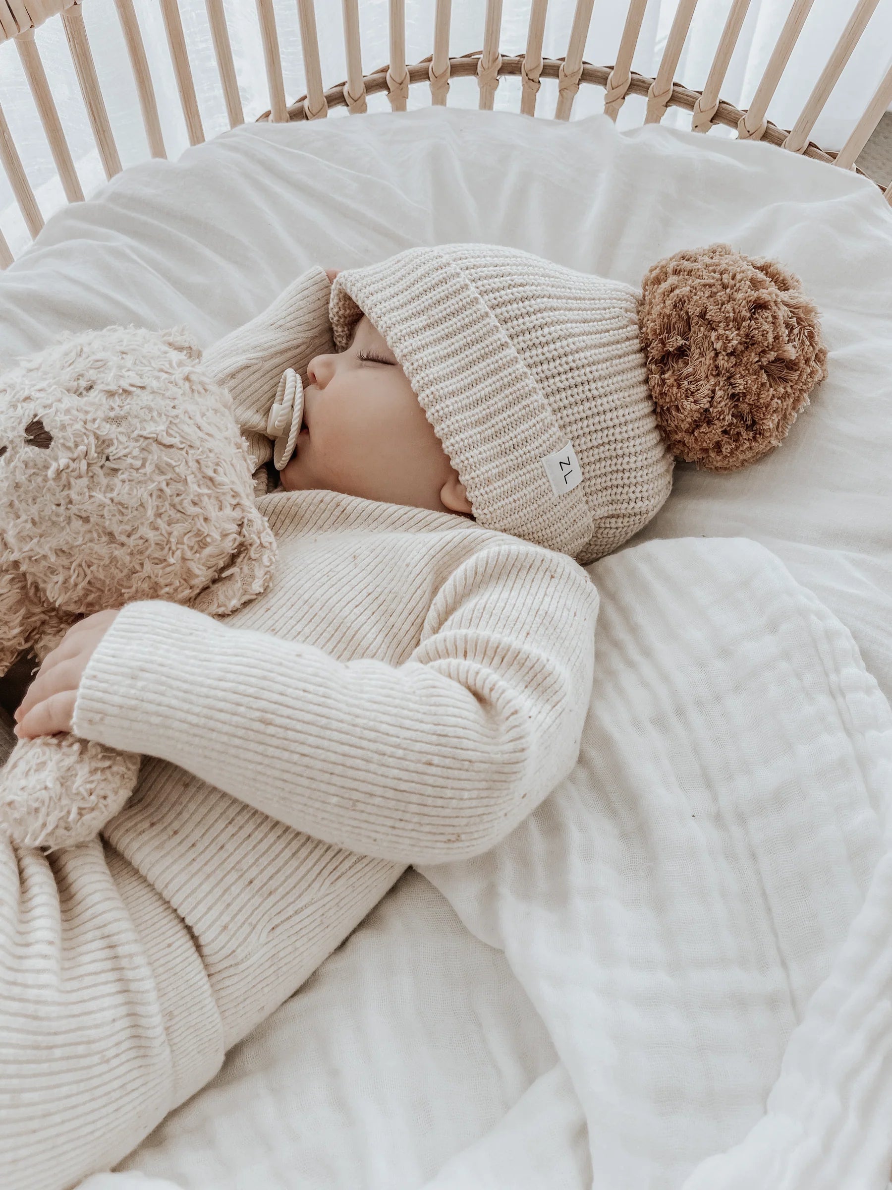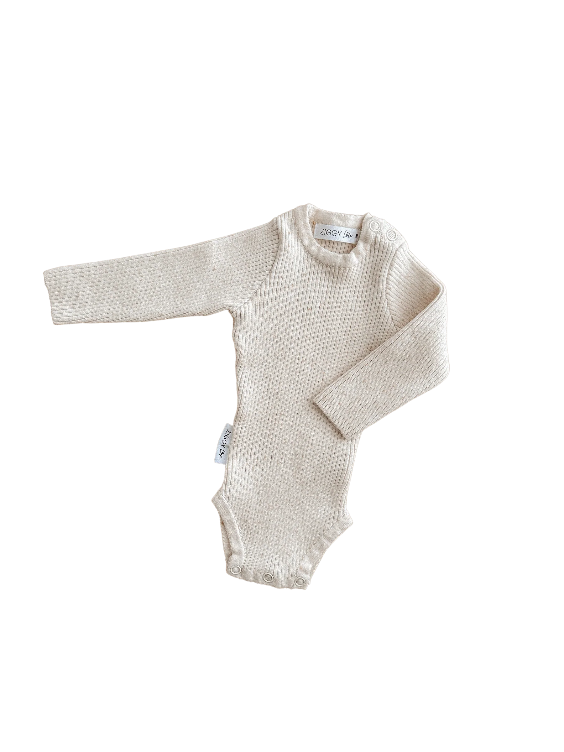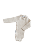 Ribbed, long sleeve bodysuit in Biscotti Fleck. Functional press snaps at crotch for easy nappy changes and press snaps on shoulder for easy on/off. Mix and match with items from our Biscotti Fleck Signature Collection.