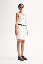 Our best-selling jeans in a summer style, the Odin Short is our new denim staple. Made of 100% cotton in our ivory wash, the Odin Short is cut to a high waisted fit with button and zip fly, classic 5-pocket styling, and a relaxed, wide leg silhouette. Sitting just above the knee, the Odin Short pairs perfectly with our range of premium basics.