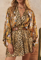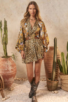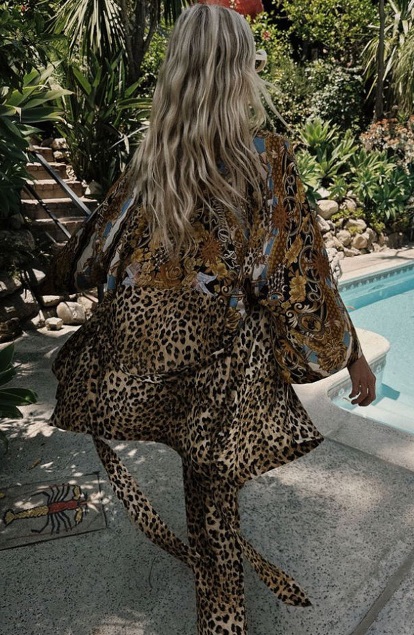 The Lovers & Dreamers Short Robe in radiant golden leopard print is a bold statement of effortless elegance. Crafted with a custom print placement, this classic Spell robe features a flattering waist tie that sculpts your silhouette. Perfect for those who embrace their inner muse, it blends timeless style with a touch of fearless glamour.