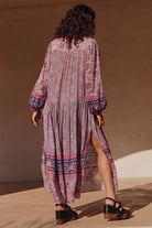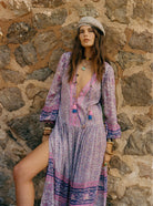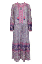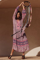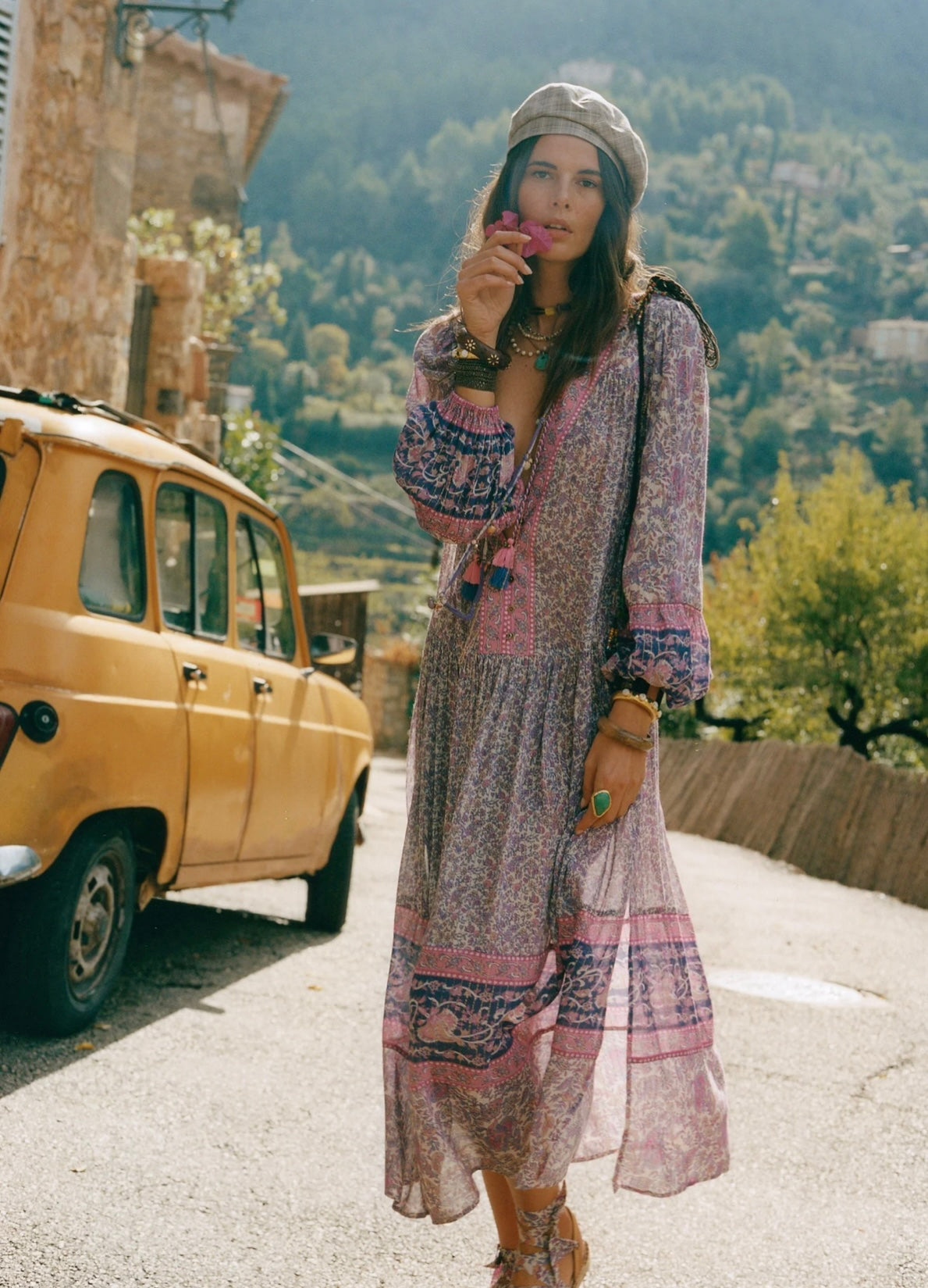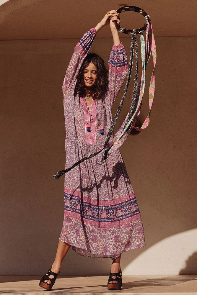 Designed with an allover print and adorned with a border print on the neckline and contrasting prints on the skirt panels, every detail exudes artistry. The drop waistline and gathered skirt create a relaxed, flowing silhouette, while the elastic cuffs and elbow-length sleeves offer an easy, flattering fit. Delicate neck ties, complete with tassel trim, add a bohemian touch to this dreamy style.
