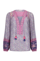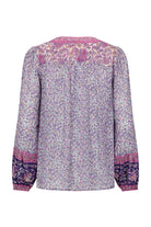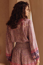 The Little Bird Lace Up Blouse in Berry is a radiant celebration of free-spirited style and luxe comfort. Crafted from a blend of organic cotton and LENZING™ ECOVERO™ Viscose with a touch of metallic shimmer, this blouse showcases an allover print accented by intricate border details on the neckline and sleeve hems.