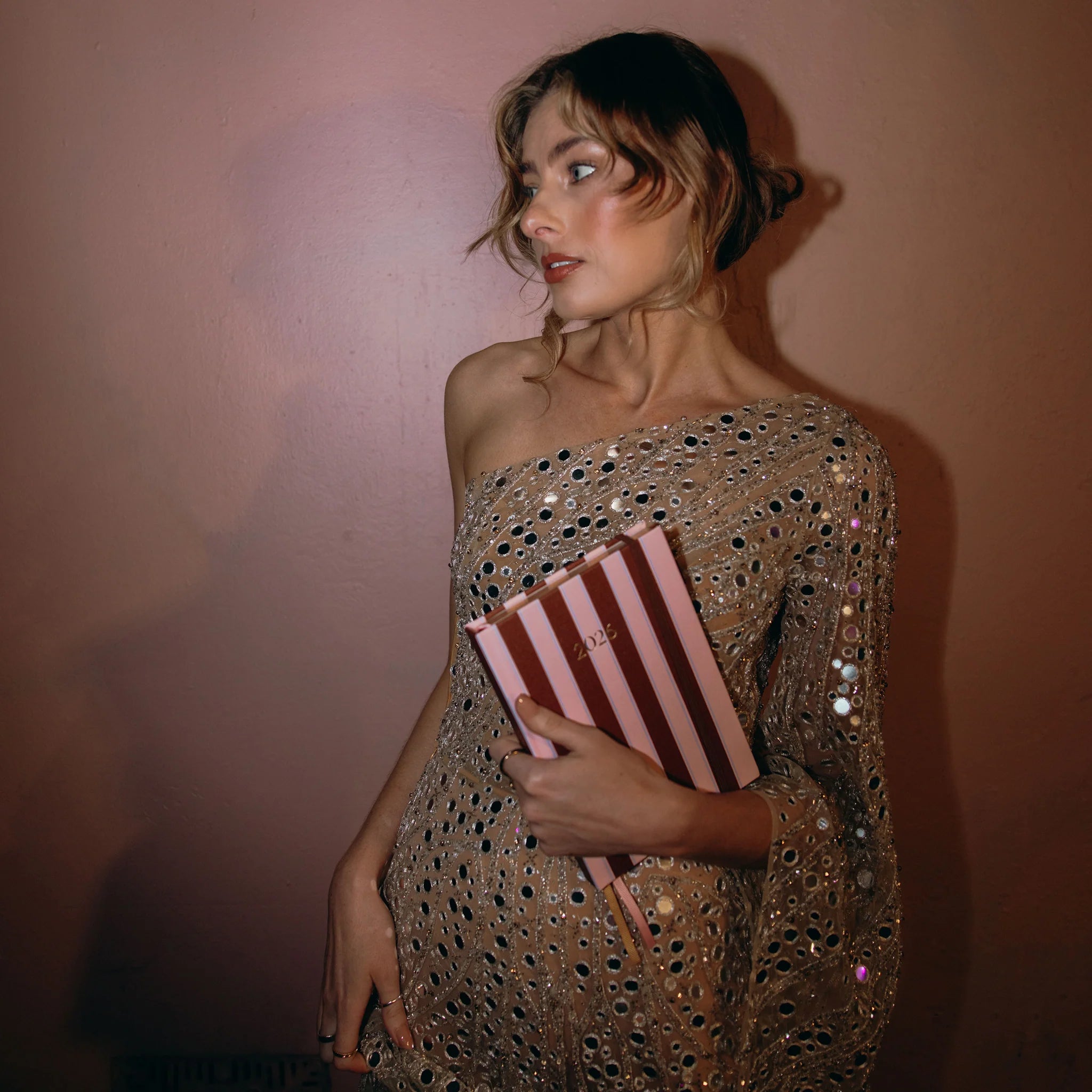 208 pages. One week per spread and monthly spreads at the beginning of each section. Gold foil stamped linen cover with gold foil edging. Three grosgrain ribbons in rust, blush and cream.