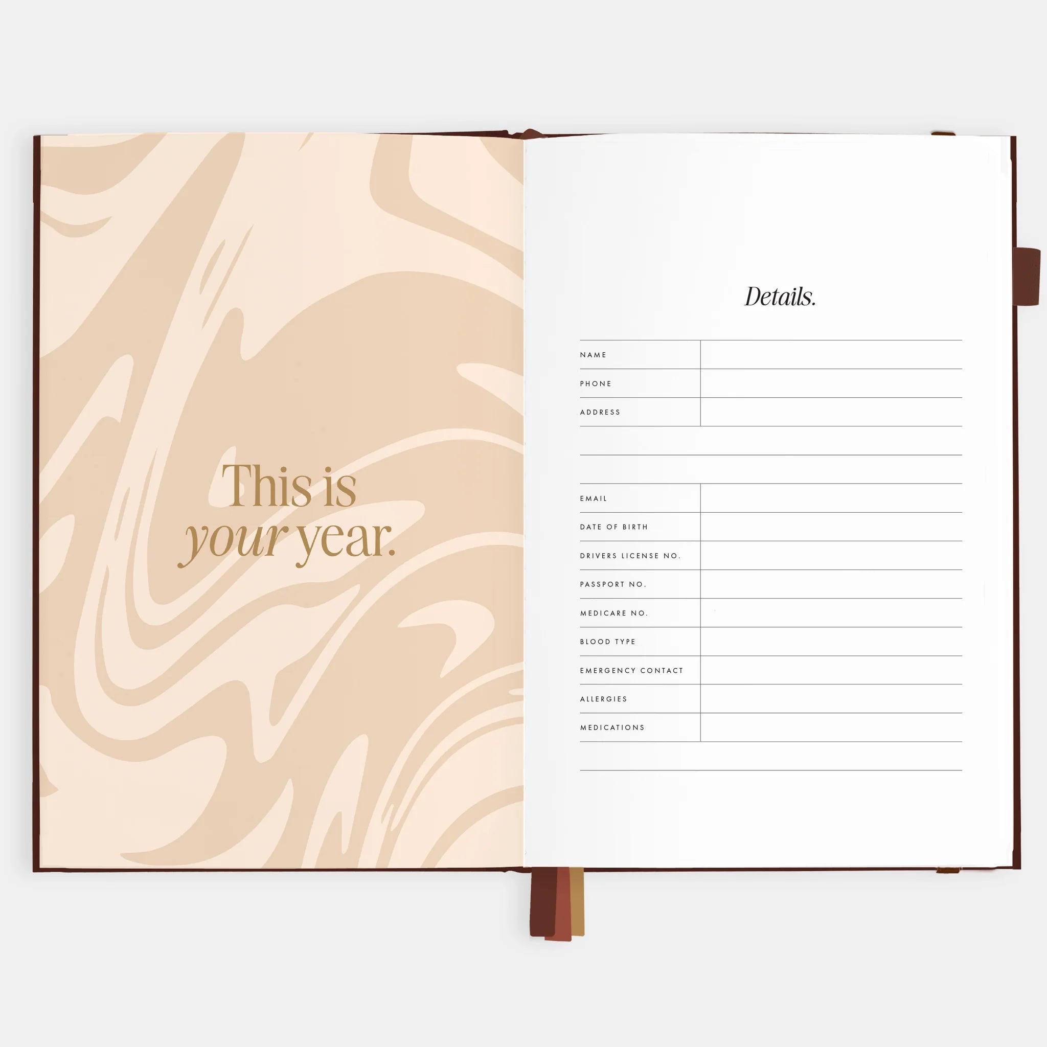 208 pages. One week per spread and monthly spreads at the beginning of each section. Gold foil stamped linen cover with gold foil edging. Three grosgrain ribbons in rust, blush and cream.