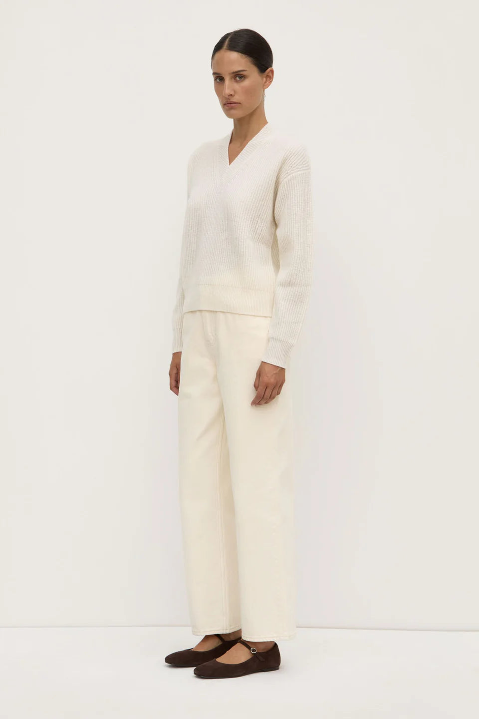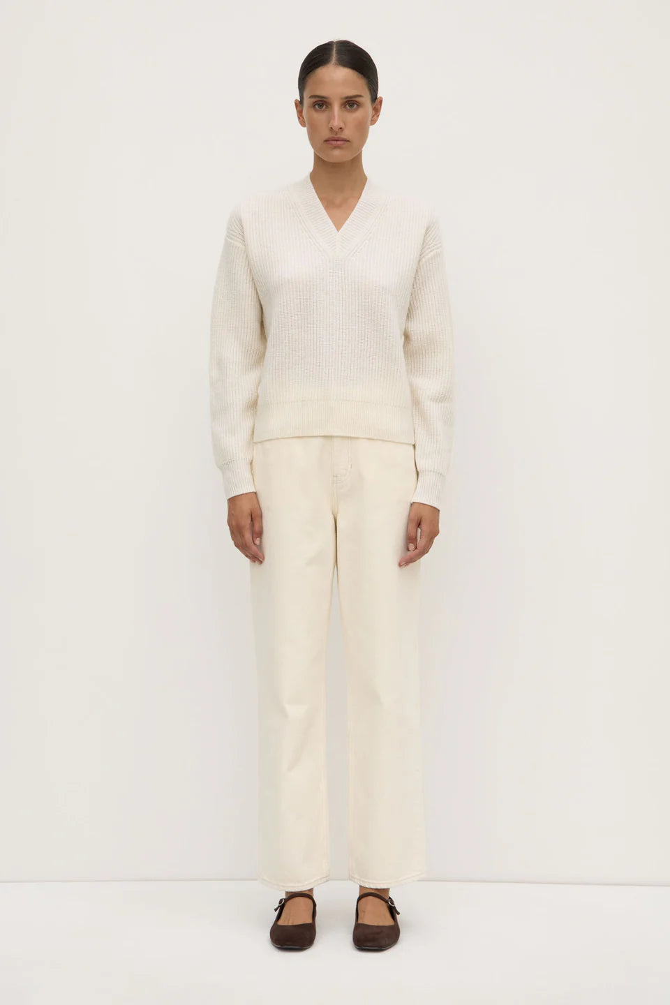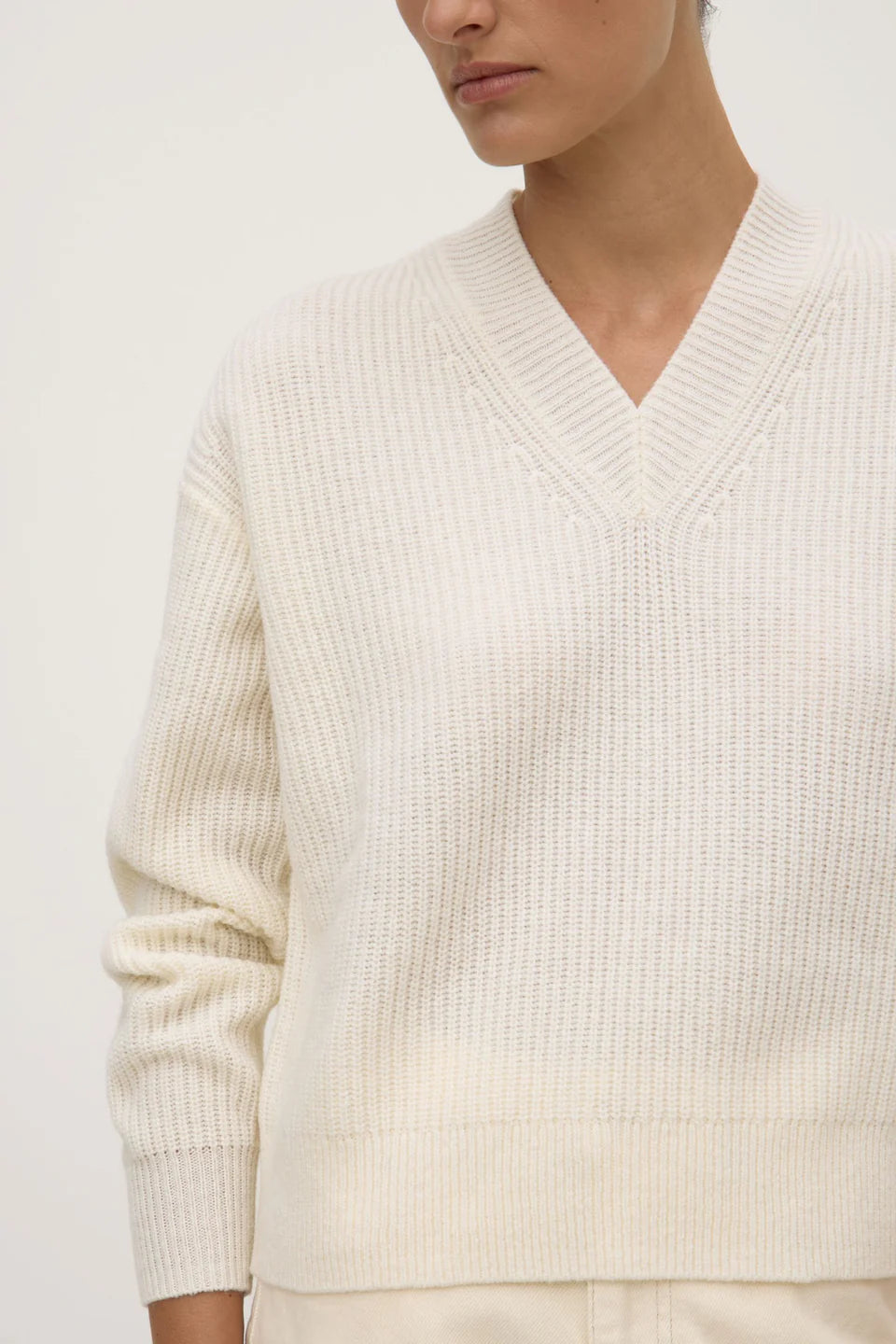 A versatile v-neck knit, made from a super soft wool blend. Features a relaxed, slightly cropped fit through the body and ribbed detailing on the neckline, cuffs and hem.
