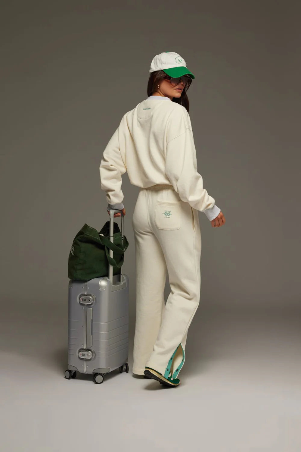 Introducing our Athletique Sweatshirt in Coconut. Cut in a beautiful cotton brushed fleece with our exclusively designed velvet applique print on the front in a contrast green colour. Our Athletique Sweatshirt is effortlessly cool and pairs perfectly with our Snap Hem Trackpant in Coconut.