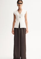 Experimenting with a lush boucle texture, the Santori Knit Top adds a fresh touch to your outfit rotation. Cut to a slim fit with a deep v-neckline and front hem split, this top is made of a soft cotton-blend ribbed knit fabric with a contrast rib panel through the bodice that creates a subtle flare through the hem. Styled with soft tailored pants, this top stands out as an effortless choice for desk to dinner table looks.
