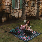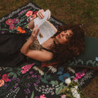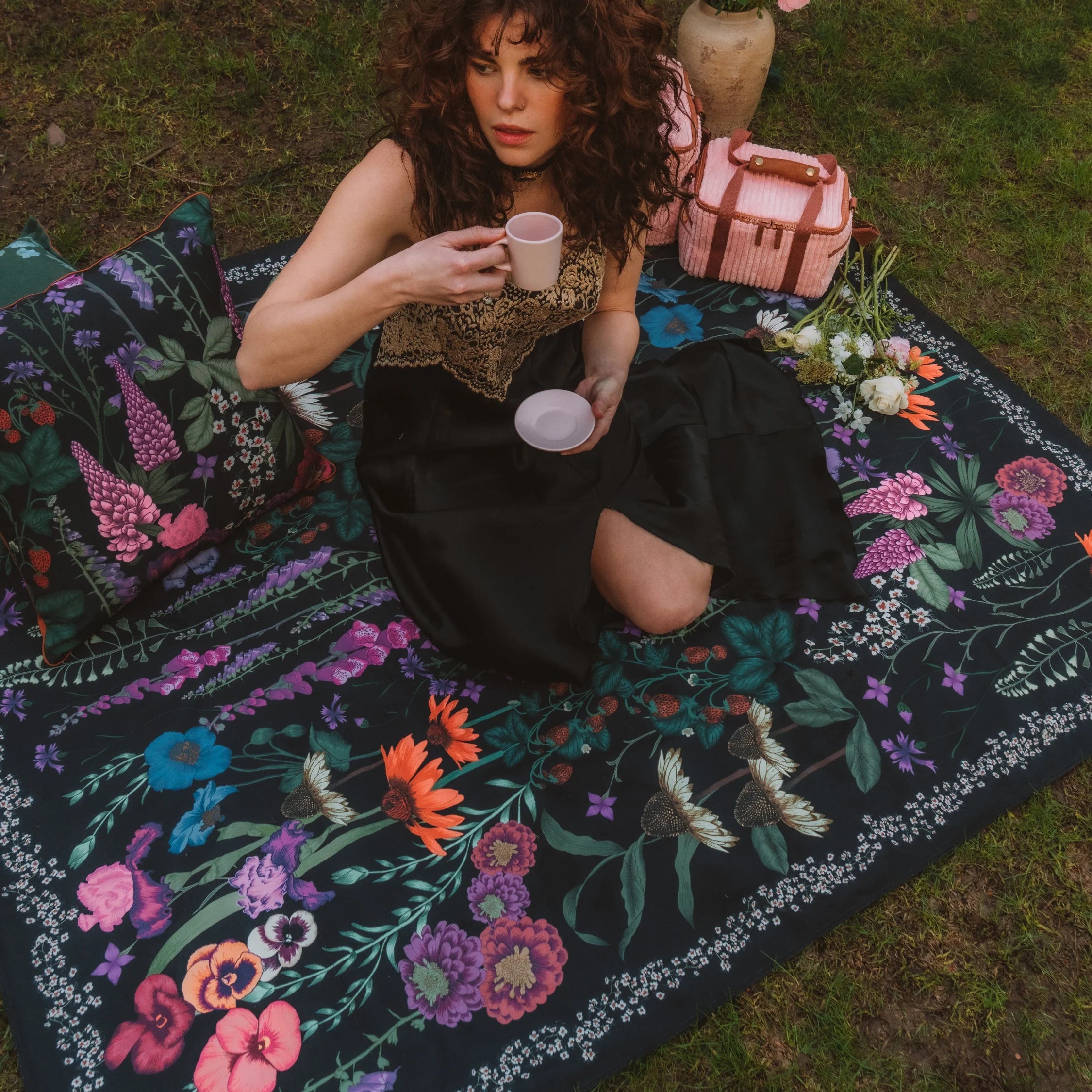 The Flourish Clover Picnic Rug, Hand drawn velvety shadow-dark foliage to bold, bright florals bursting with life.