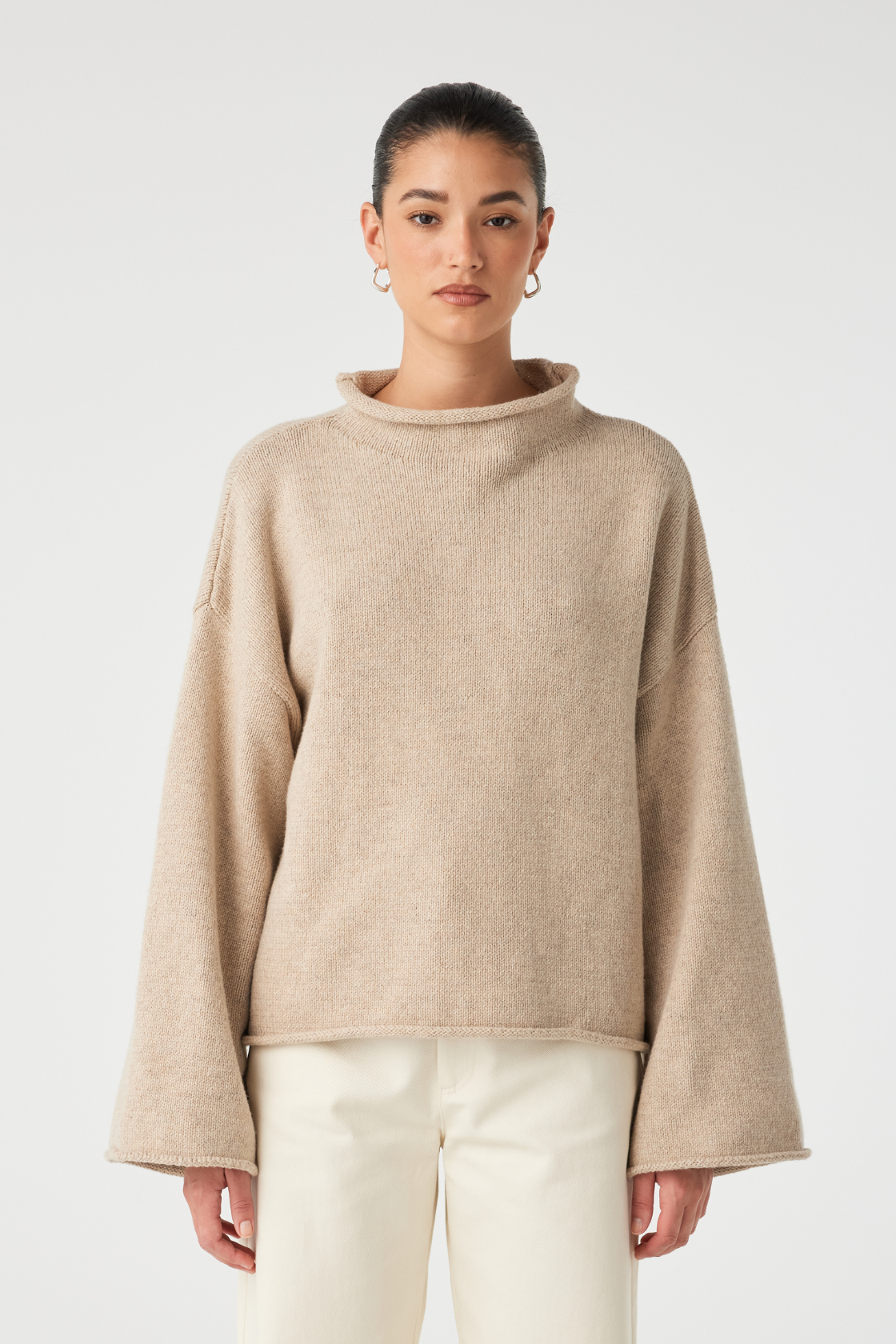 A relaxed funnel-neck sweater with a cropped silhouette. Designed with dropped shoulders, wide sleeves, and a soft cotton-merino blend for lightweight warmth.