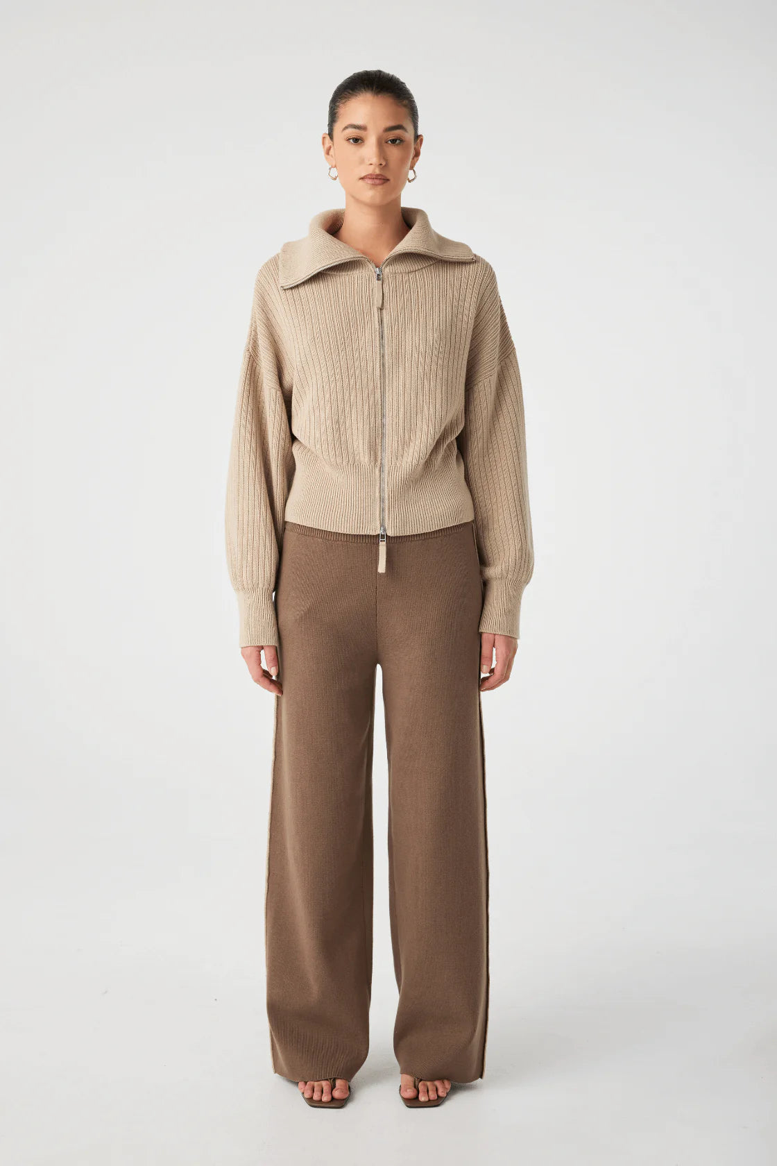 The Quincy Zip Sweater pairs a relaxed, cropped shape with an exaggerated funnel neck and double-ended zip for versatile styling. A ribbed knit texture and fitted cuffs bring soft structure to its easy silhouette.
