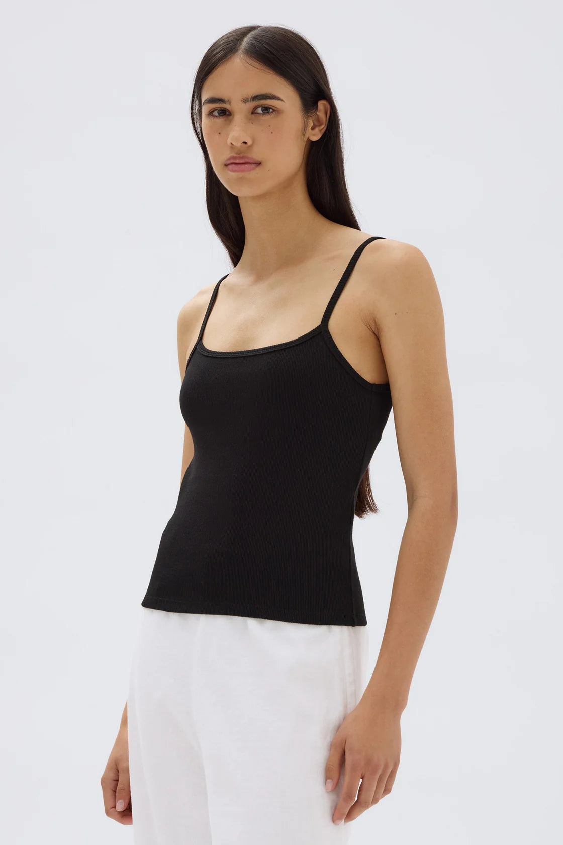Simple fitted strap tank with wide apex neckline, fitted body width. Crafted with soft black cotton rib.