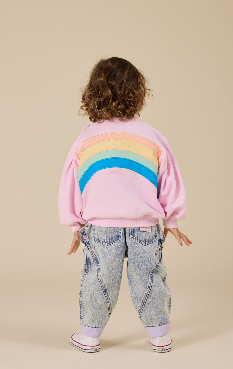 True to size. Balloon style sleeves. Ribbed cuffs and neckline. Snap buttons on the neck for easy dressing up to size 2. Features a woven badge on front chest and a very special rainbow panel across the back.