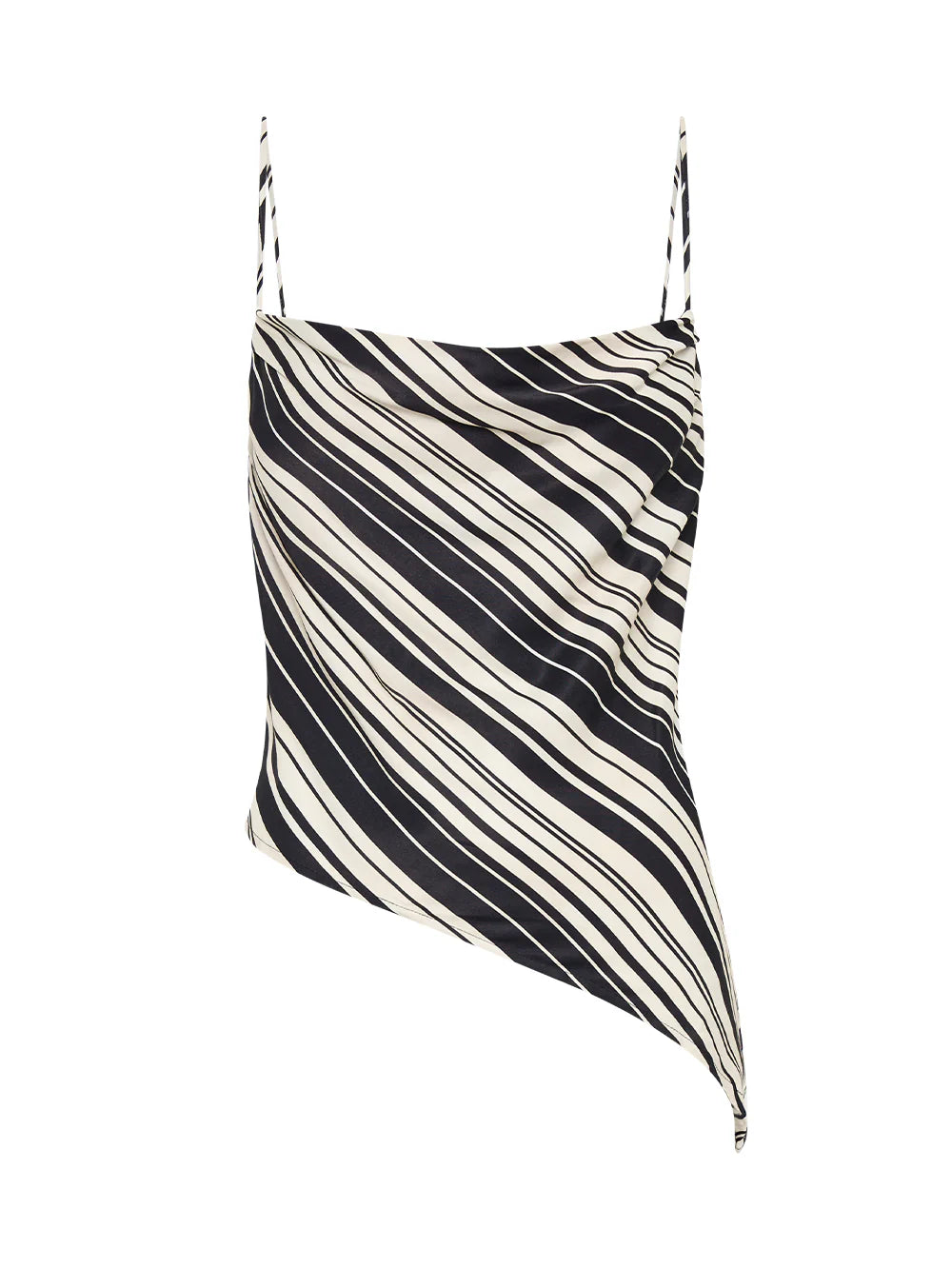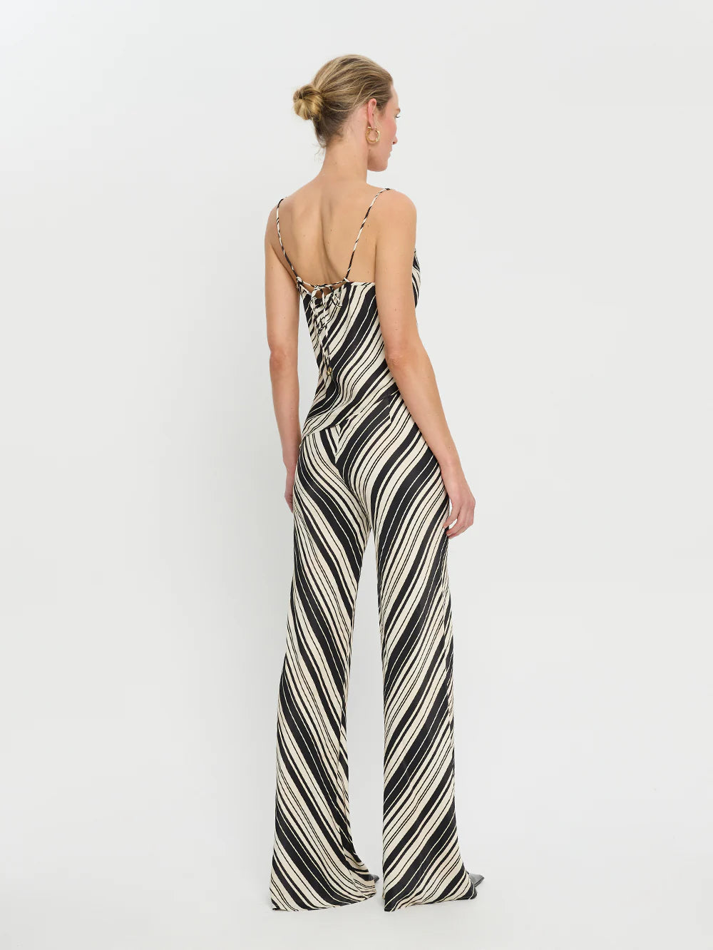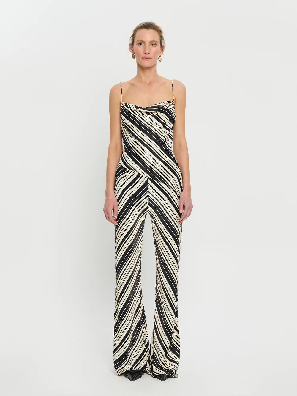 Sara is a vintage inspired, directional stripe in tonal hues of black and cream. The Sara Top is an asymmetric scarf top silhouette and features a straight neckline and straps that tie at the back, complete with a bias cut hemline. Pair with the Sara Pant to complete the look.