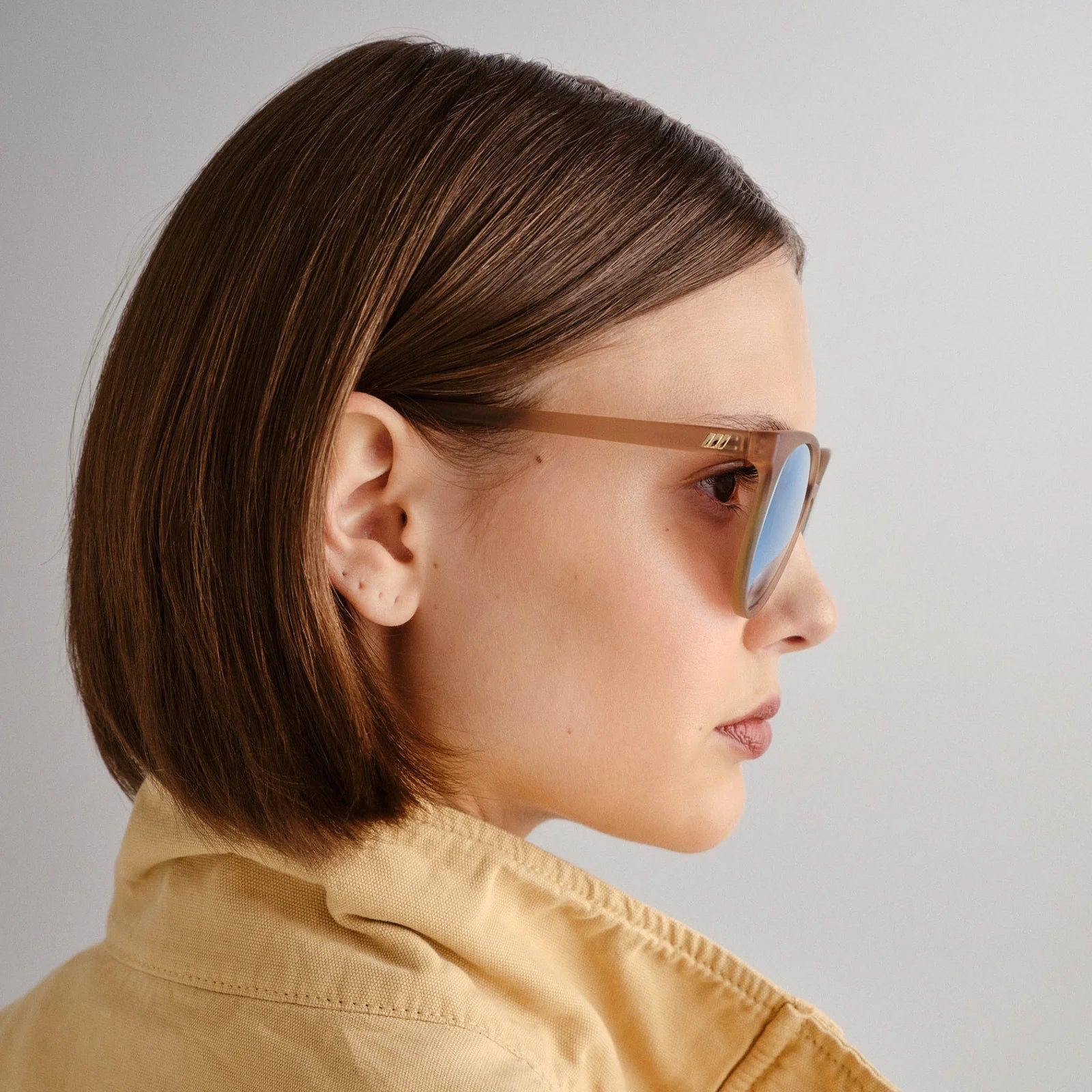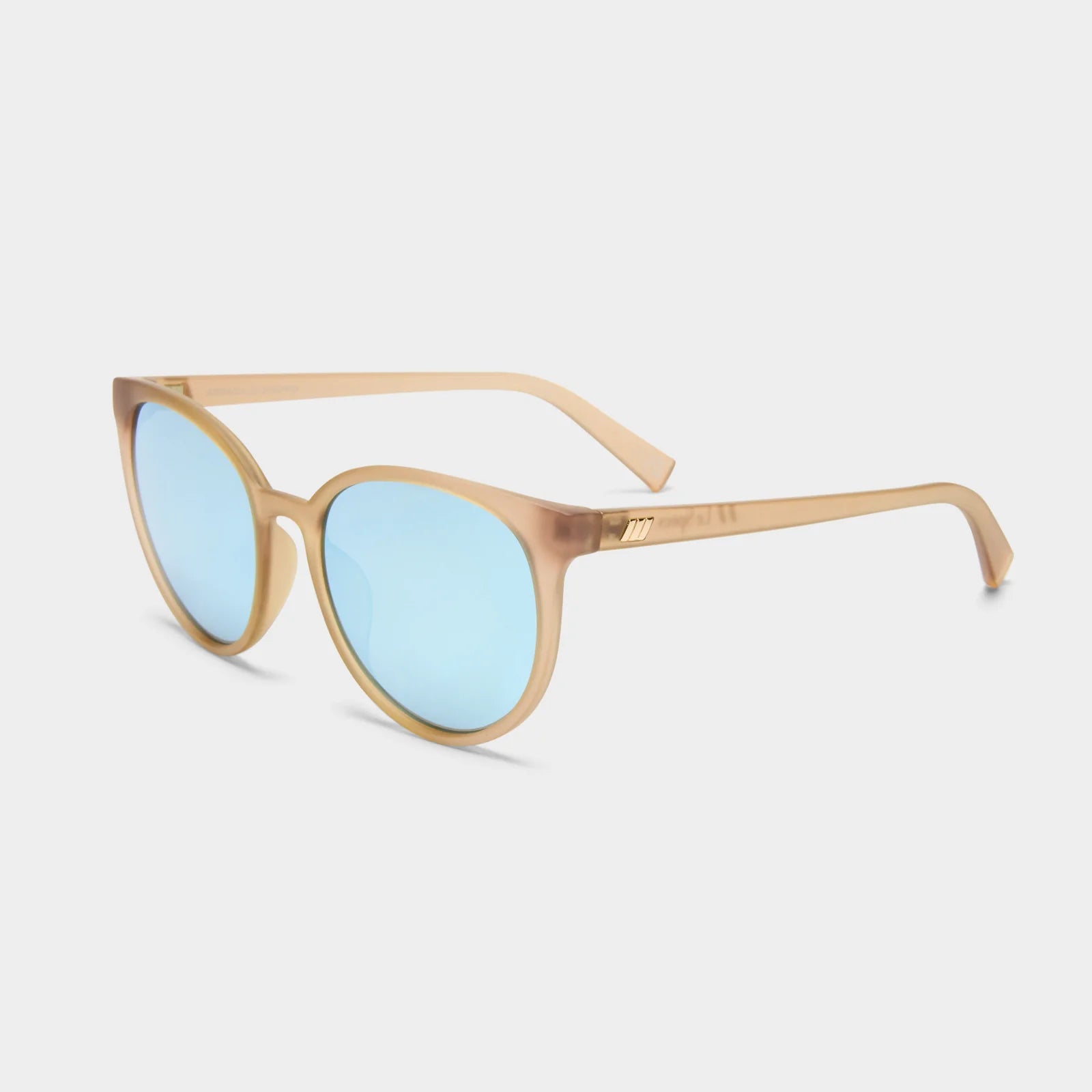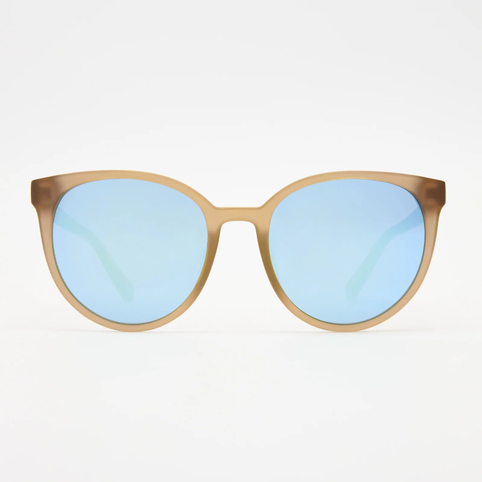 • Finished in a matte translucent light brown frame with high contrast blue mirror lenses.