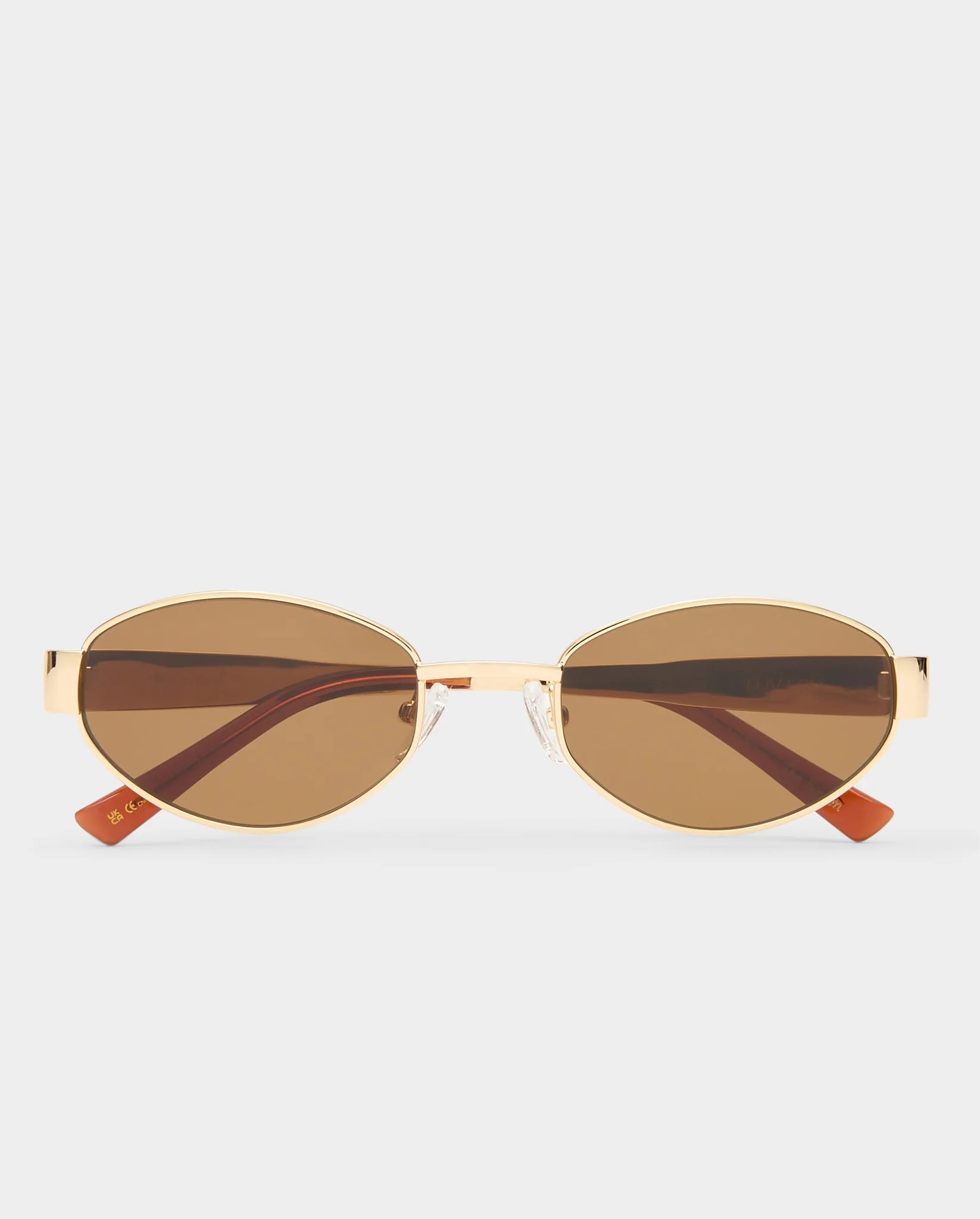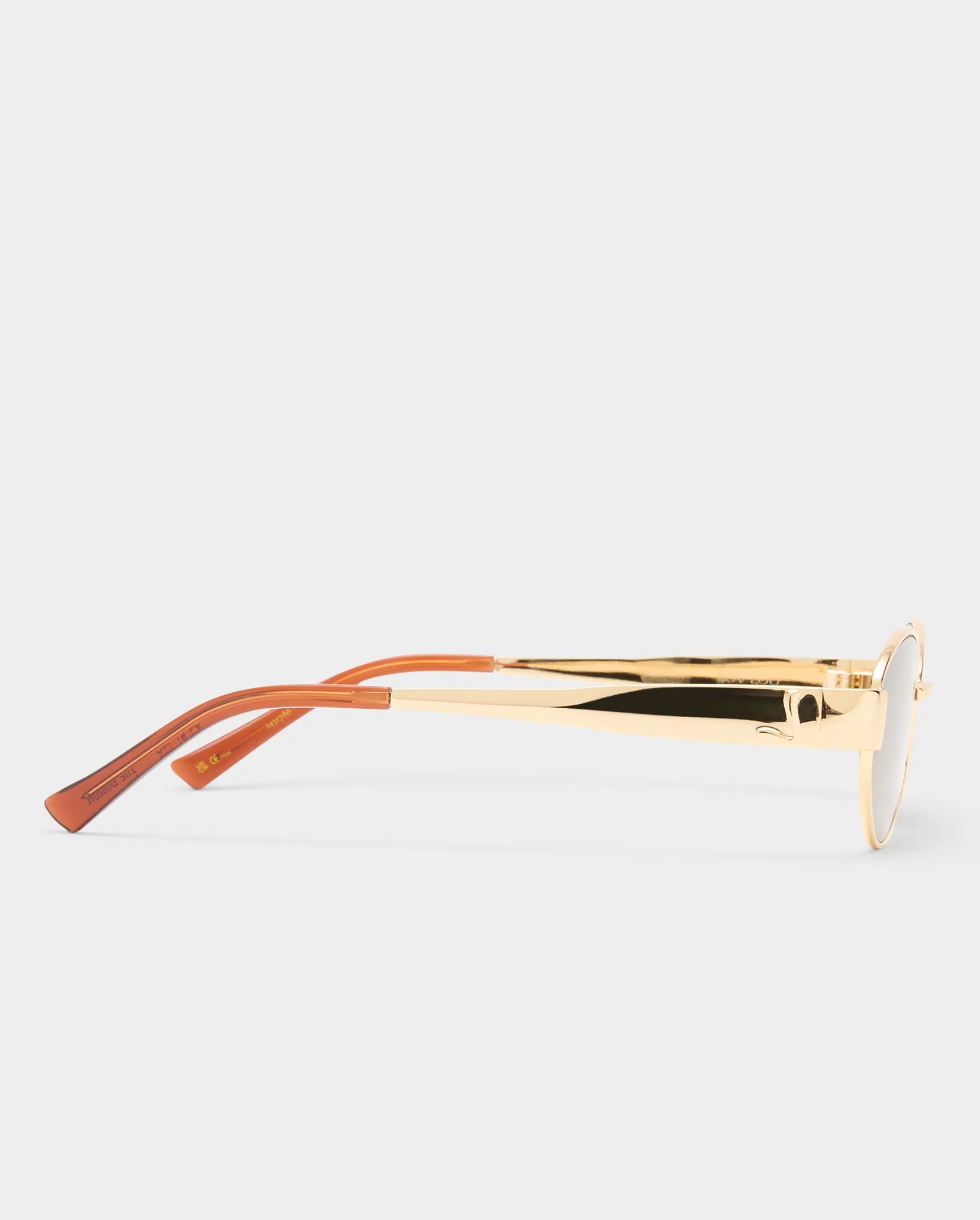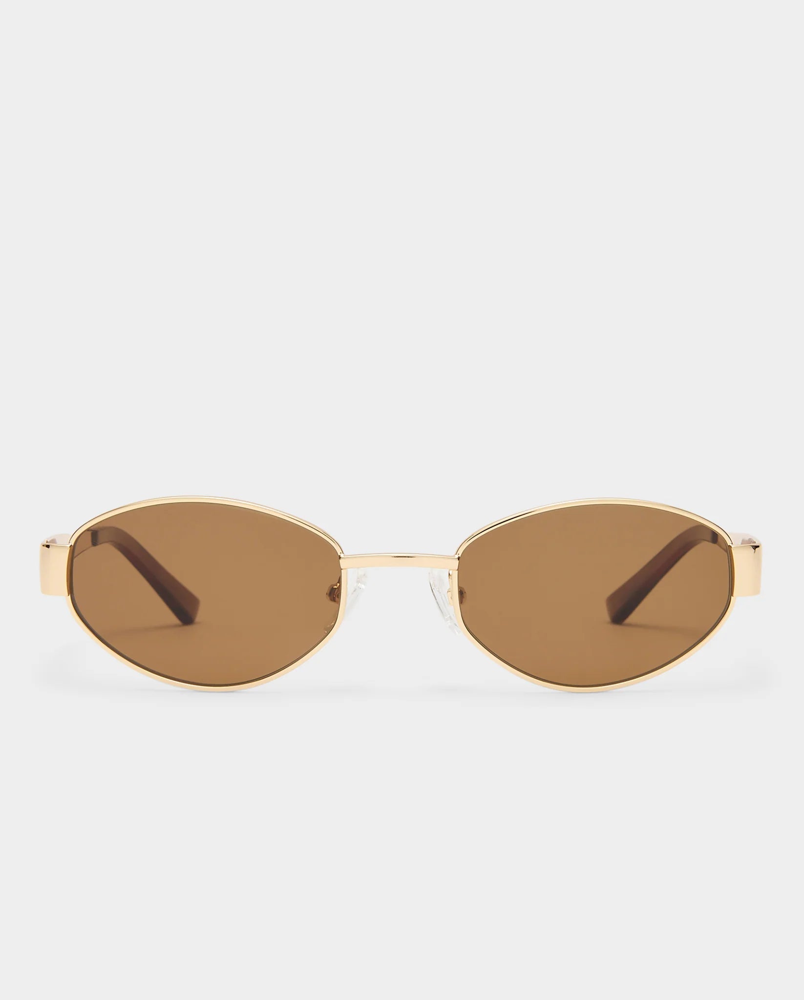 The Boston is an ode to the 90’s, which evokes a vintage aesthetic. This oval frame features a statement metal arm, with a signature gold stamp detail. This premium wire frame comes with a brown polarised lens adding to its high end quality.