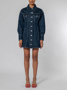 Our must-have denim dress. The Grace Dress is generously cut through the shoulder, tapers in at the waist, flaring out at the hip for a unique hourglass silhouette. Featuring traditional denim seaming and metal tack buttons. Crafted in premium rigid denim.