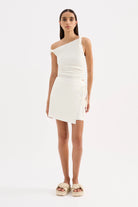 The Lotta Linen Mini Skirt in white is made from 100% linen which has been washed for a soft, breathable hand feel. The silhouette is high waisted and mini in length. Features include mock wrap front panel with yoke and double tie detail, and an invisible zipper at back. This skirt is fully lined.