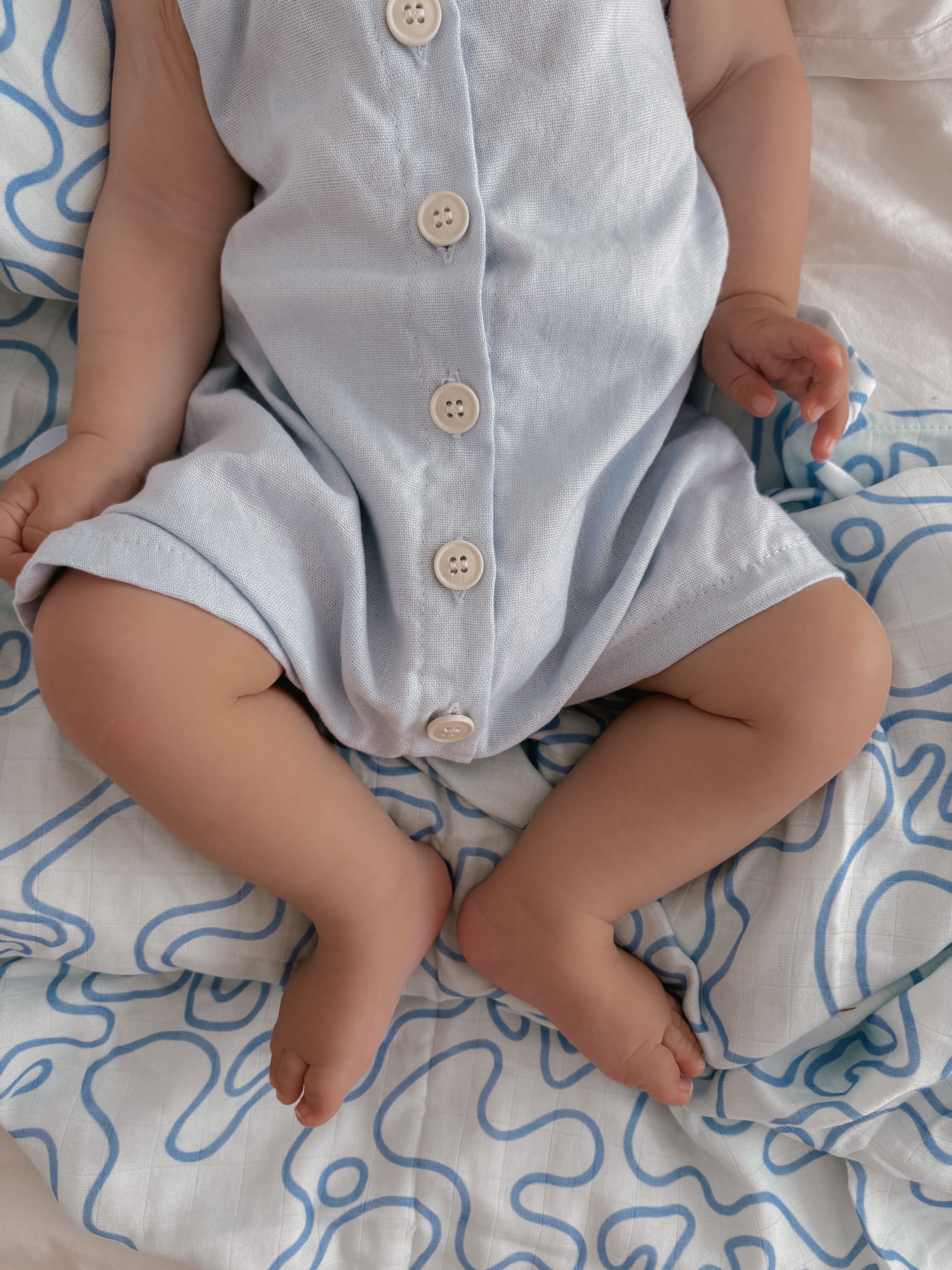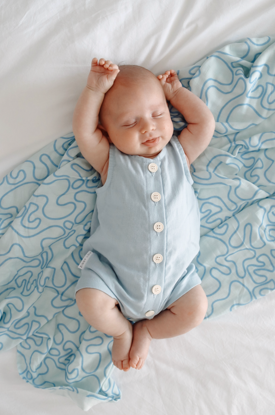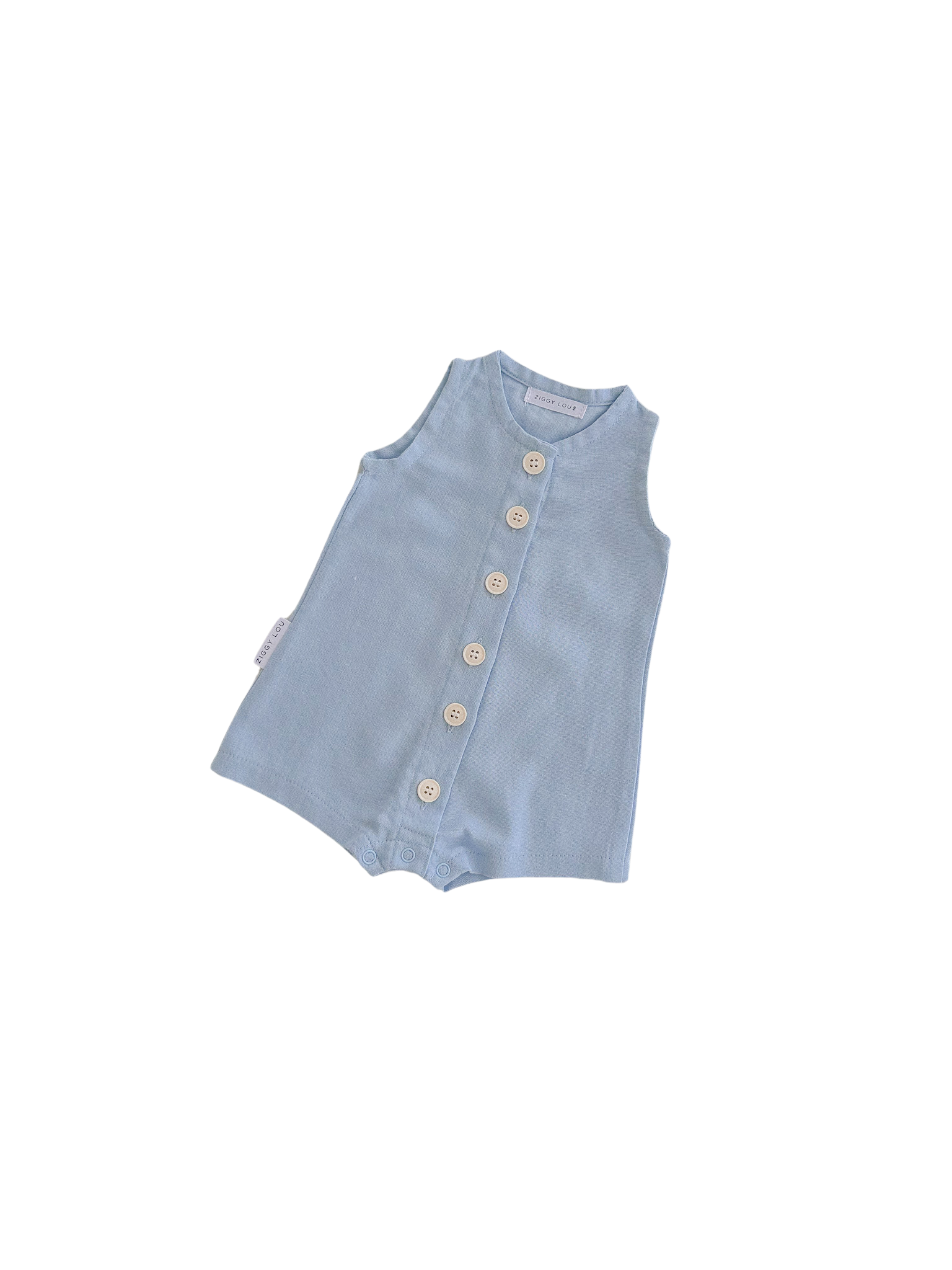 Linen blend romper with functional buttons down the front and press snaps at crotch for easy nappy changes. Mix and Match with items from our Tide + Zen Summer Collections.