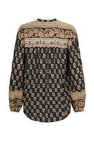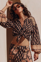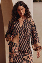The Marmont Blouse in Whiskey is a timeless piece infused with effortless bohemian charm. Crafted from soft LENZING™ ECOVERO™ Viscose, this beauty features an allover print with intricate border detailing on the shoulders and sleeve hems. The relaxed silhouette is complemented by elastic cuffs, a button-up front, and delicate neck ties for a touch of vintage romance. Whether styled with the matching Marmont Maxi Skirt or your favorite denim, this blouse is sure to become a forever favorite.