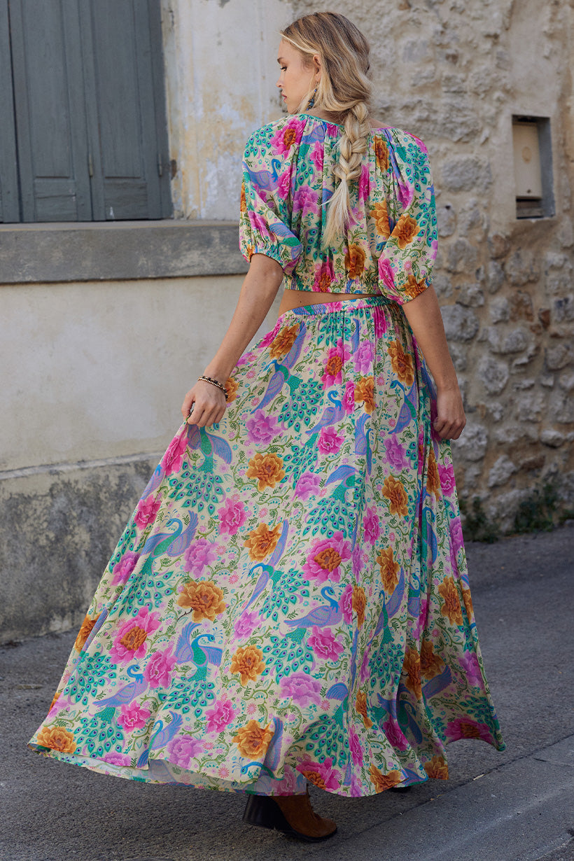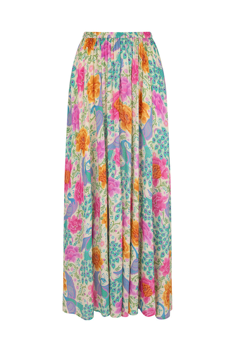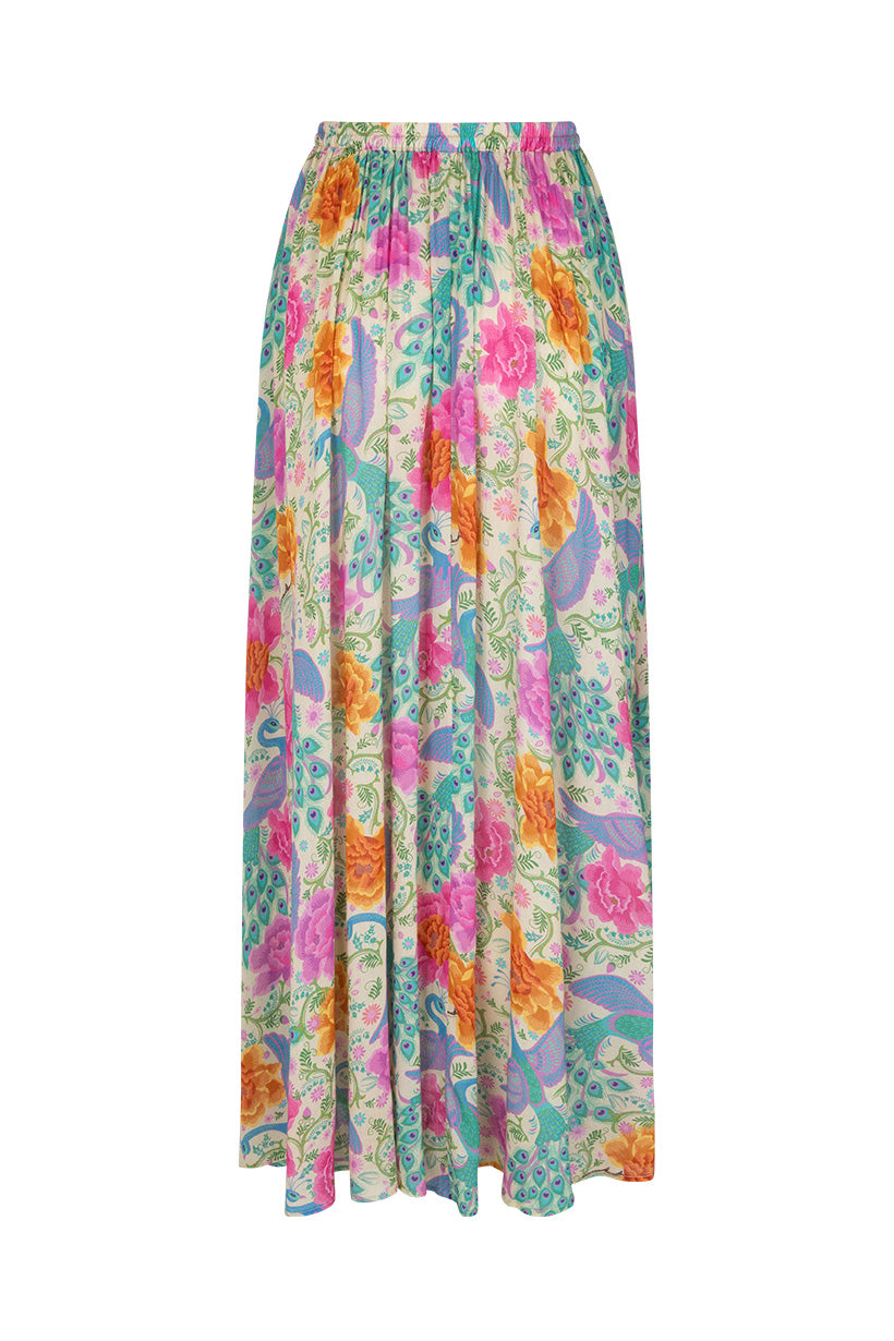 The Bohème Maxi Skirt in Spring is crafted for the rebel hearts. Bold and elegant, our skirt is adorned with wild blooms and peacock motifs, striking in vibrant hues reminiscent of an artist palette.