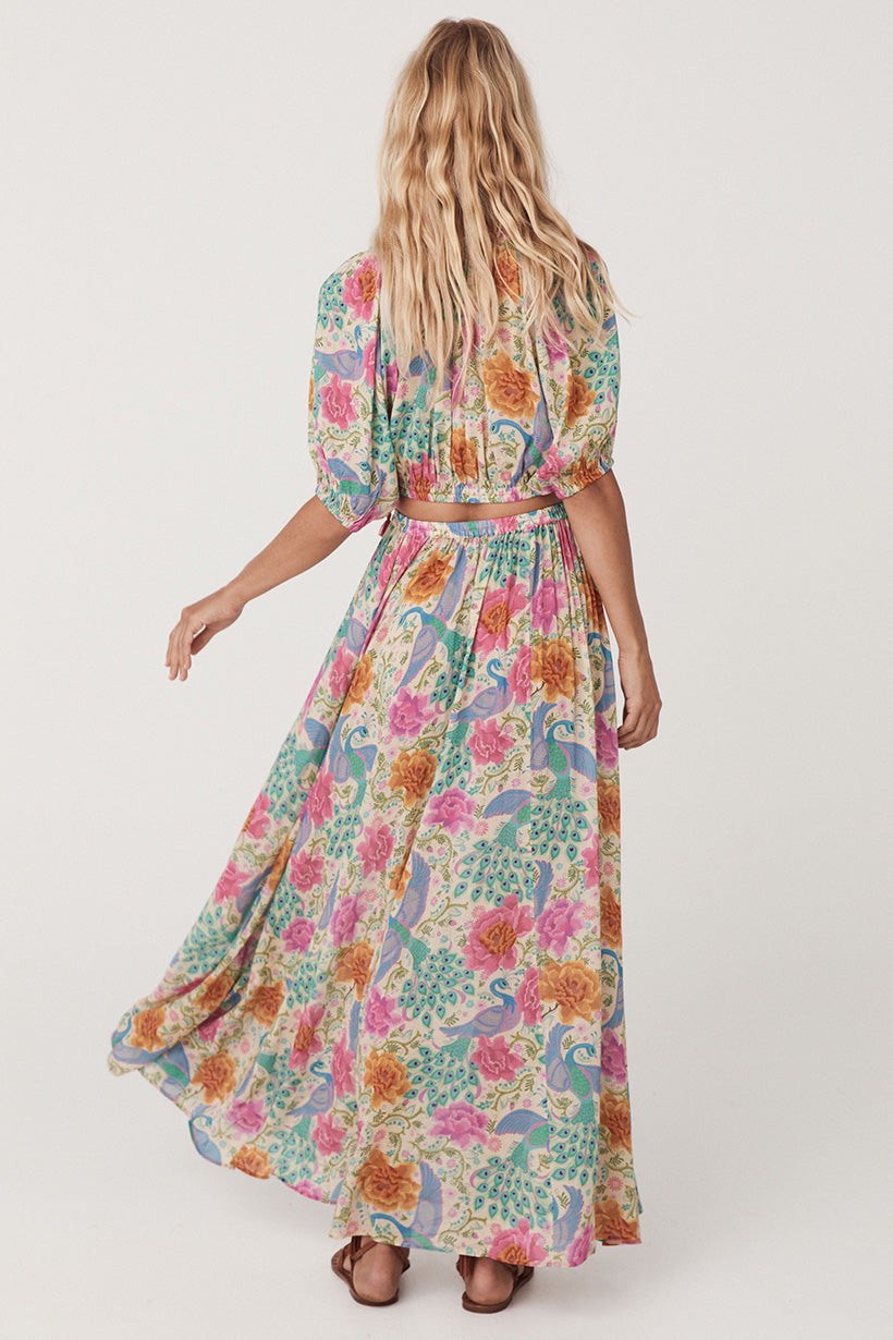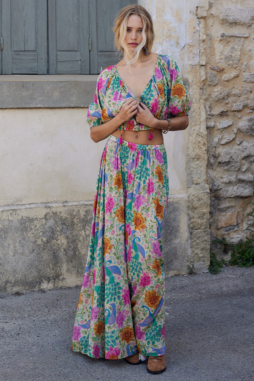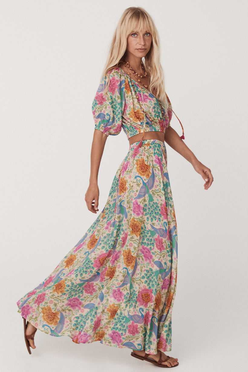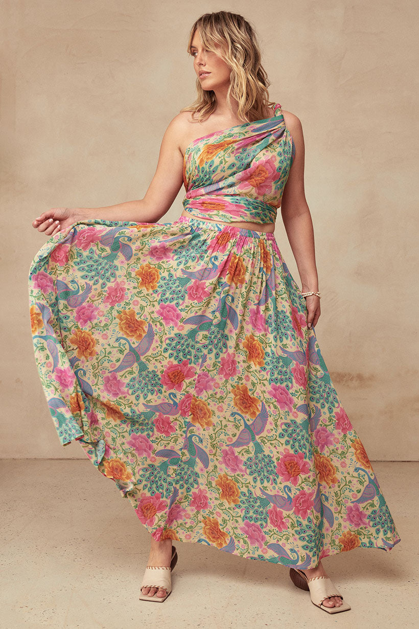 The Bohème Maxi Skirt in Spring is crafted for the rebel hearts. Bold and elegant, our skirt is adorned with wild blooms and peacock motifs, striking in vibrant hues reminiscent of an artist palette.