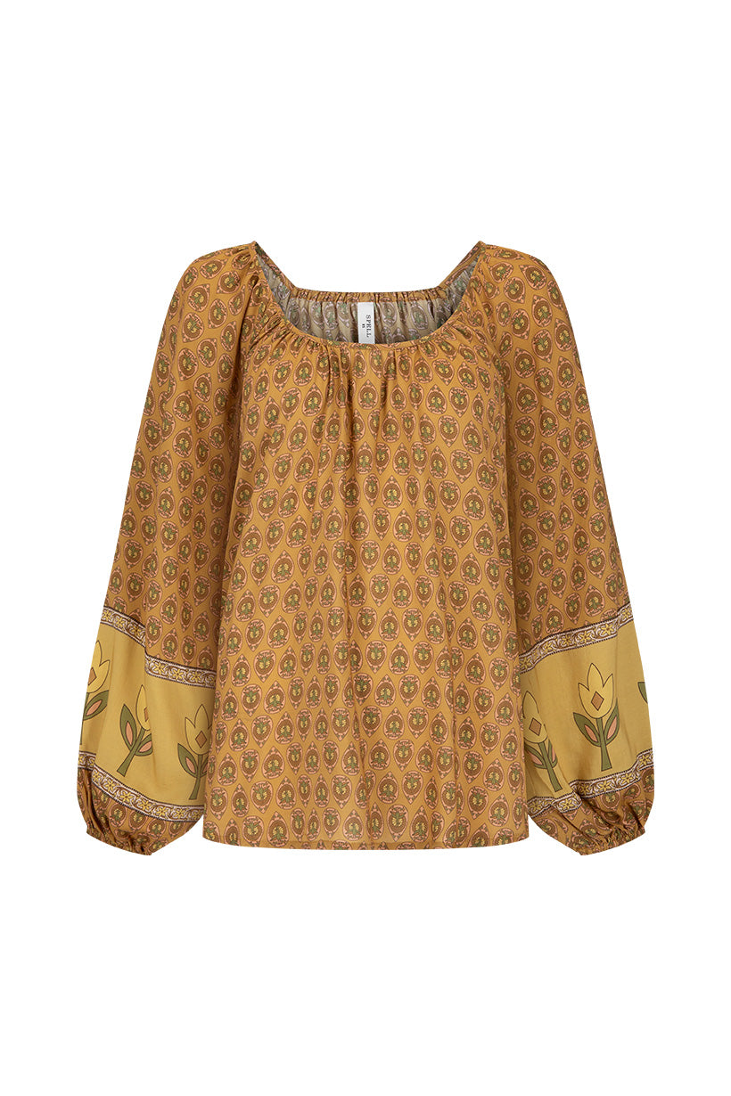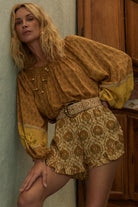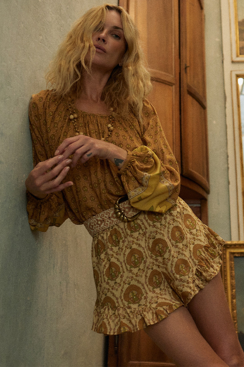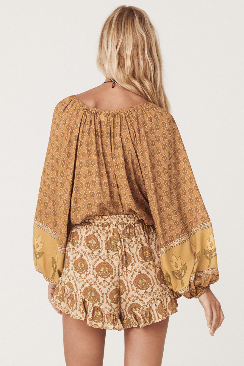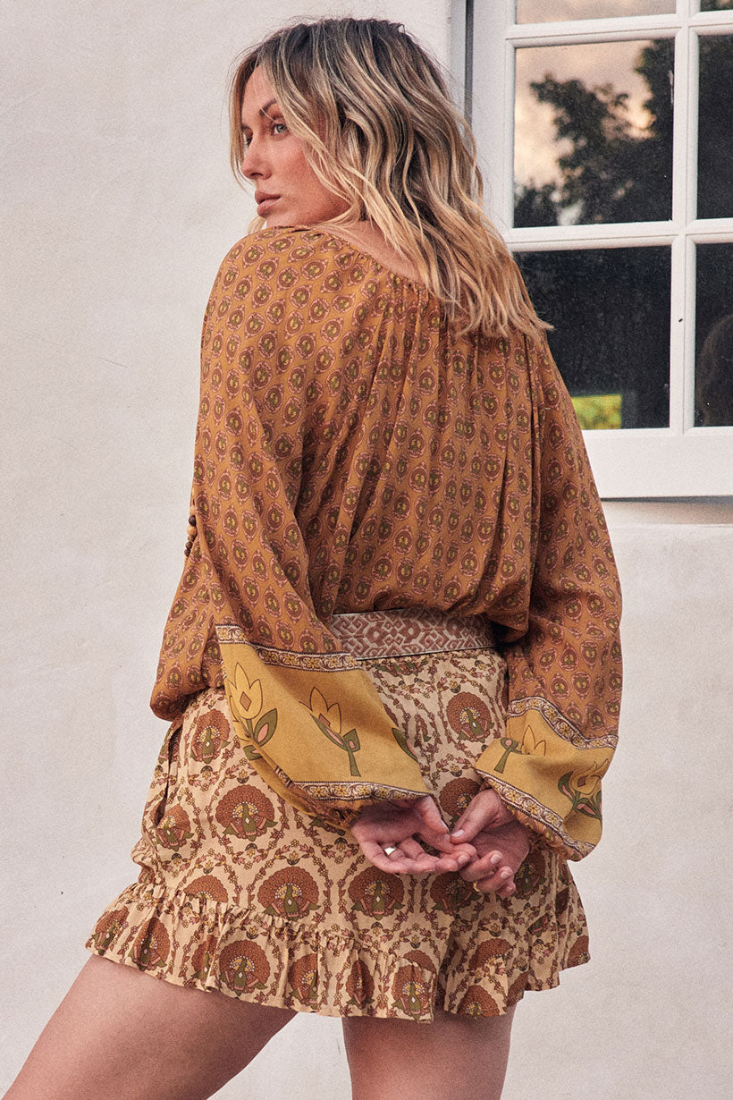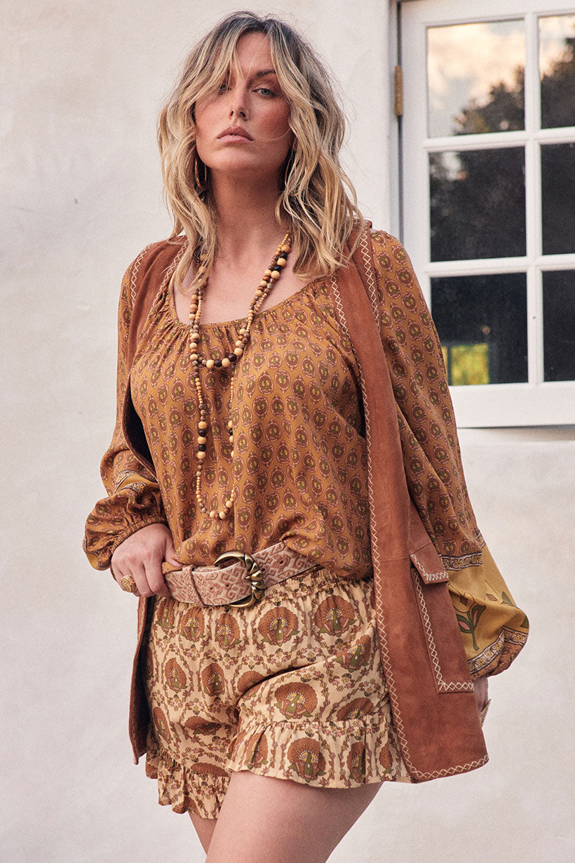 Our blouse perfectly pairs with black denim and black boots for brunch with the girls or with our Château Maxi Skirt, tan belt and woven sandals for market mornings.
