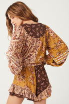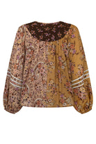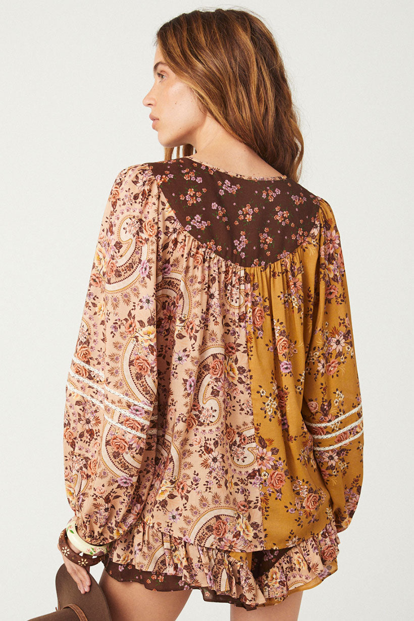 The Melody Blouse in Woodstock is crafted for the rebel hearts. Our newest blouse features a unique patchwork print placement from the design team ~ our honeyed amber print to one side, our rambling florals in pink and cream to the other with our retro brown and ditsy floral print across the back yoke complete this statement style and echo the free spirit of our rebel muse. Inserted ladder lace frames the billowing sleeves, a button down front offers styling versatility while the neck line includes ties with hand made tassels ~ all details that add effortless bohemian glamour to your ensemble. Pair with our Melody Frill Short and boots for road trips across sundrenched landscapes or pair with black denim and loafers for brunch with the girls.