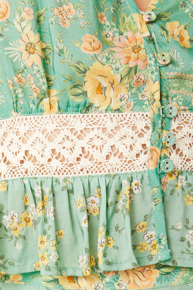Our Melody Cropped Blouse in Arizona is mesmerizing as if plucked from 70’s festival daydream. Our crop features a V neckline with button down front, a romantic frill detail at the sleeve and hem and 70’s inspired crochet lace details evoking the free spirit of the rebel romantics. Pair with fine jewels and the Melody Maxi Skirt for a garden soiree or with your favourite denim for date night.