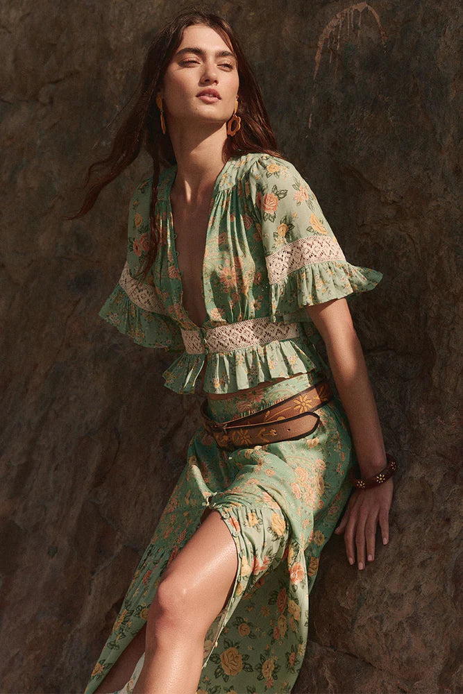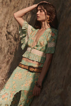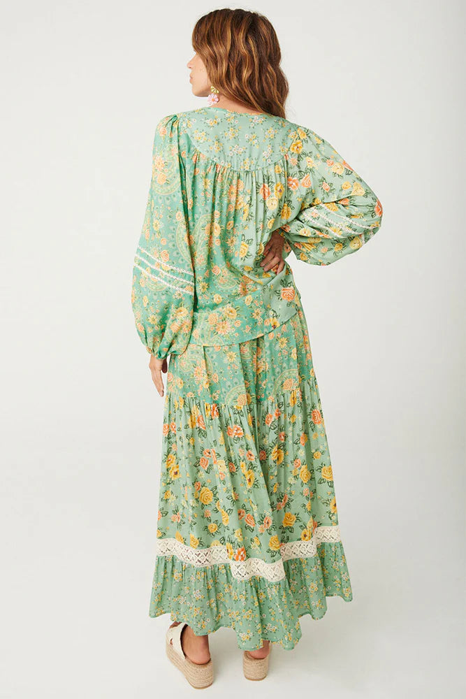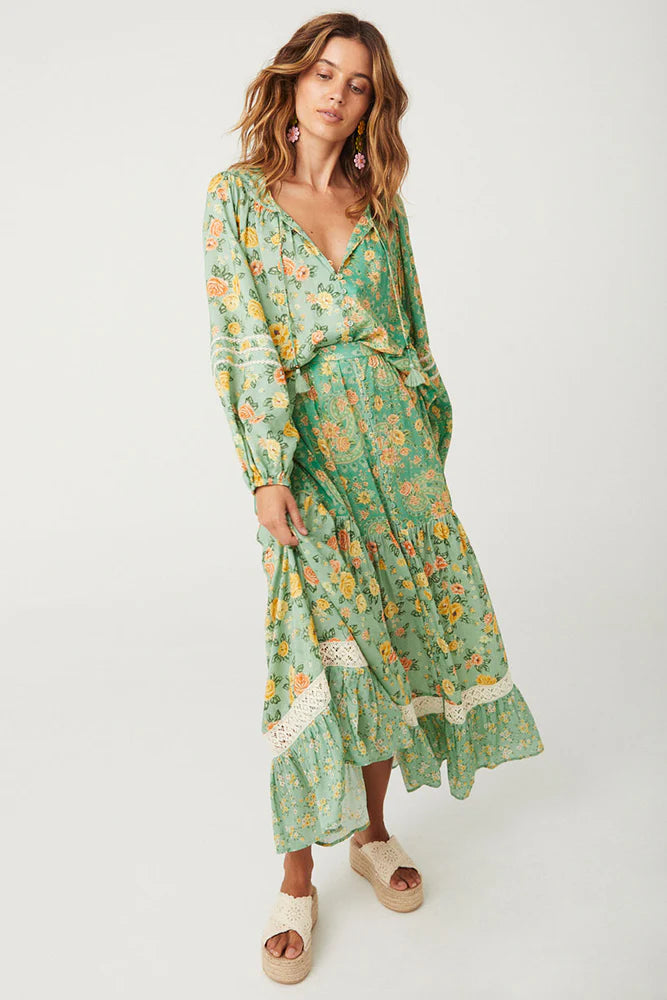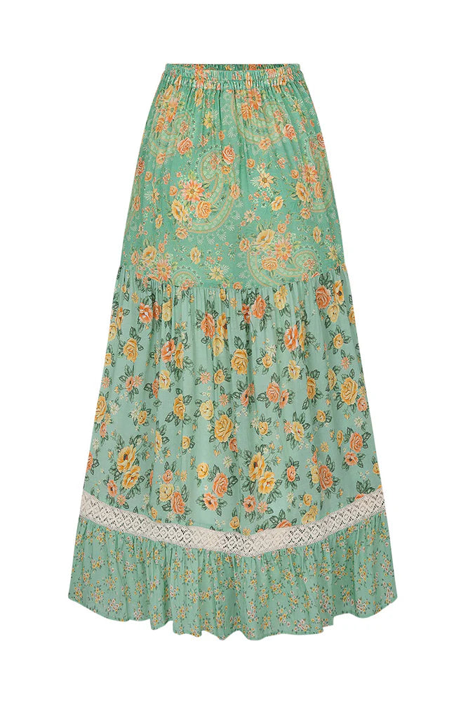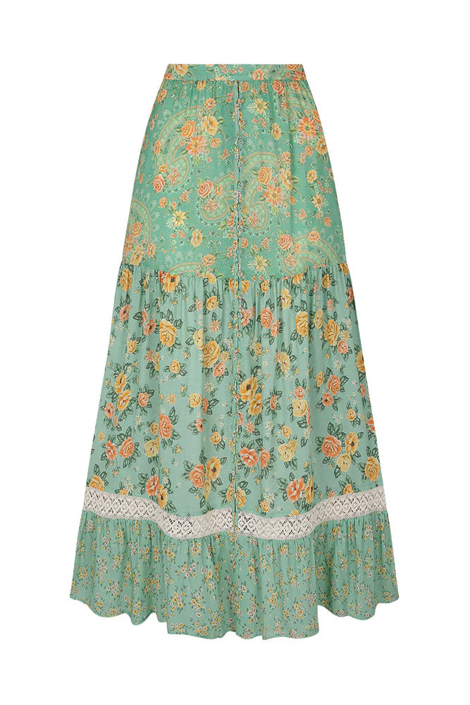 The Melody Maxi Skirt in Arizona is charming and elegant featuring a tiered skirt that cascades to the floor, inserted lace details, a button down front and fixed front waist adding a touch of sophisticated glamour. The tiered design adds volume and movement, making it ideal for twirling under festival lights. Unbutton the skirt to show a little leg and pair with a white cami and slides for luxe vacay styling. Our skirt is endlessly versatile, whether you're exploring a bustling market or enjoying a sunset soiree, this skirt transforms from day to night with ease and ensures you move with an air of insouciant grace.