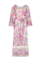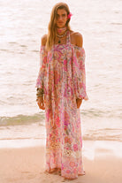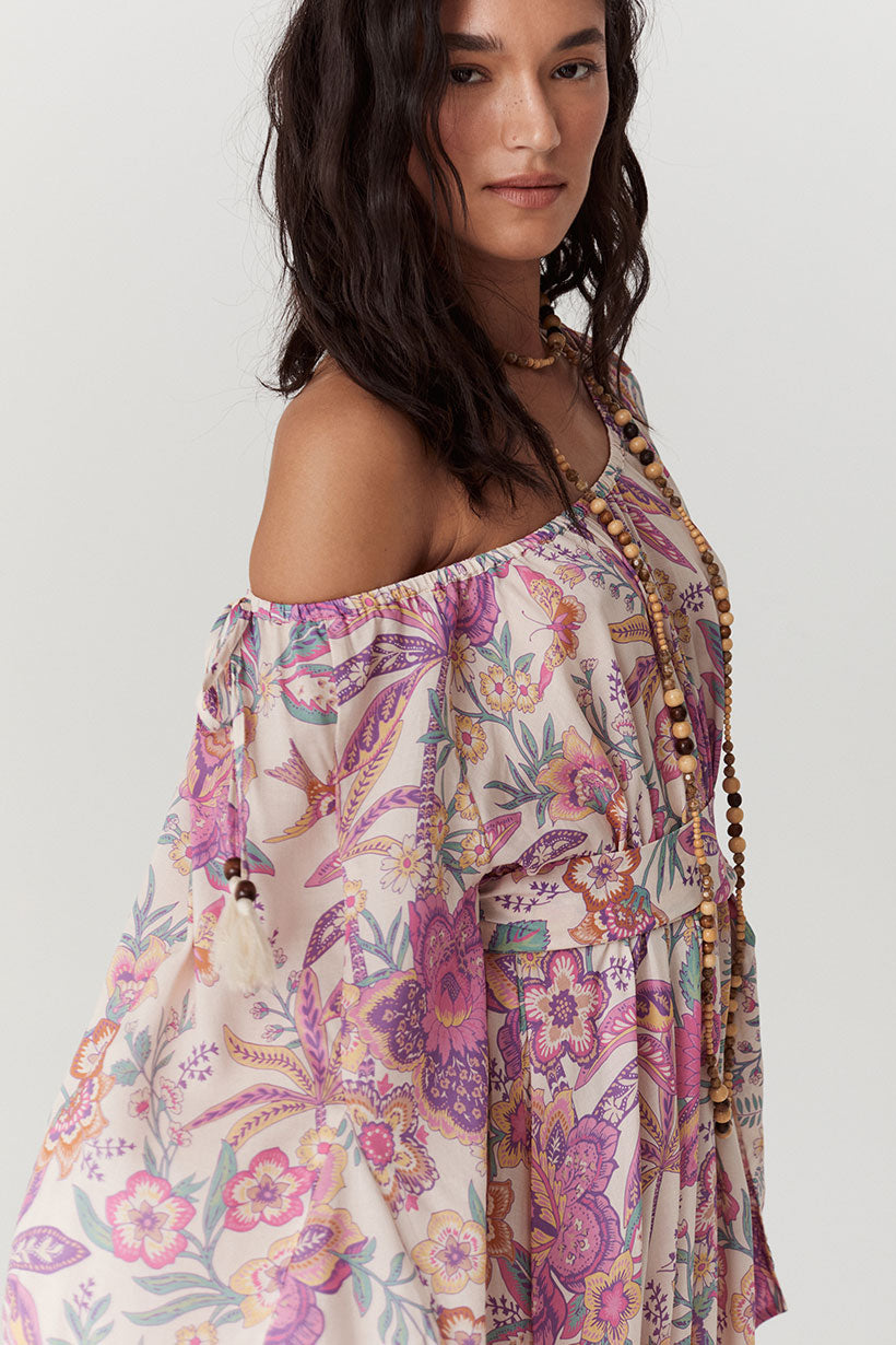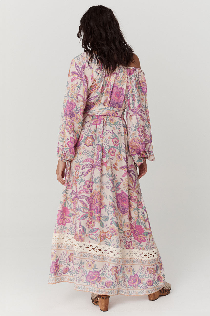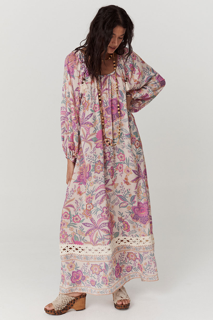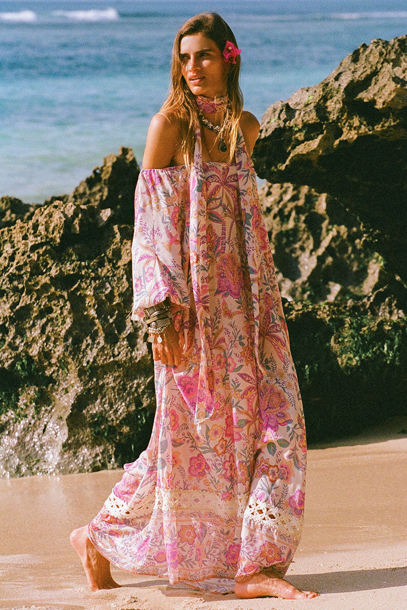 The Mojave Lily Gown in Opal is a high drama piece inspired by the bohemian styles of the ’70s and a nod to our own cult-favourite ‘Mary-Kate’ styles. With functional ties and wooden bead accents at the neckline, this gown offers adjustable styling before flowing into a voluminous, tiered skirt. Crochet lace inserts add textural depth, while long, voluminous sleeves with elasticated cuffs allow for effortless movement. We imagine our gown paired with crochet sandals to release your inner island goddess or with a tan mule and a slicked back do for an elevated affair. Exuding luxury with every step our gown is sure to make a statement no matter the occasion.