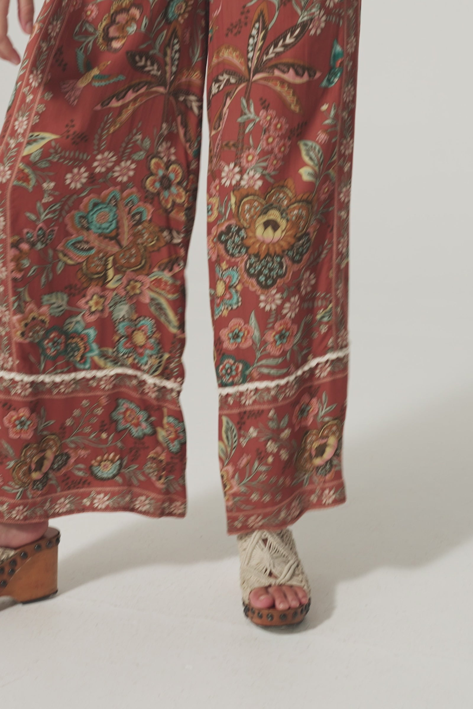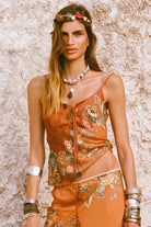 Our Mojave Lily Lace Up Cami in Amber is a slinky new style that combines design detailing with innovation. Each panel's print placement is engineered specifically for the garment, showcasing colour blocking in amber and hazelnut tones with the signature Mojave Lily print acting as a striking border between the hues. The lace-up front detail, complete with wooden beads and tassels, only heightens her opulence, while shaping under the bust enhances a flattering fit that skims down to the hip. Pair with our Mojave Lily Bias Skirt and fine jewels for a rooftop soiree at sunset.