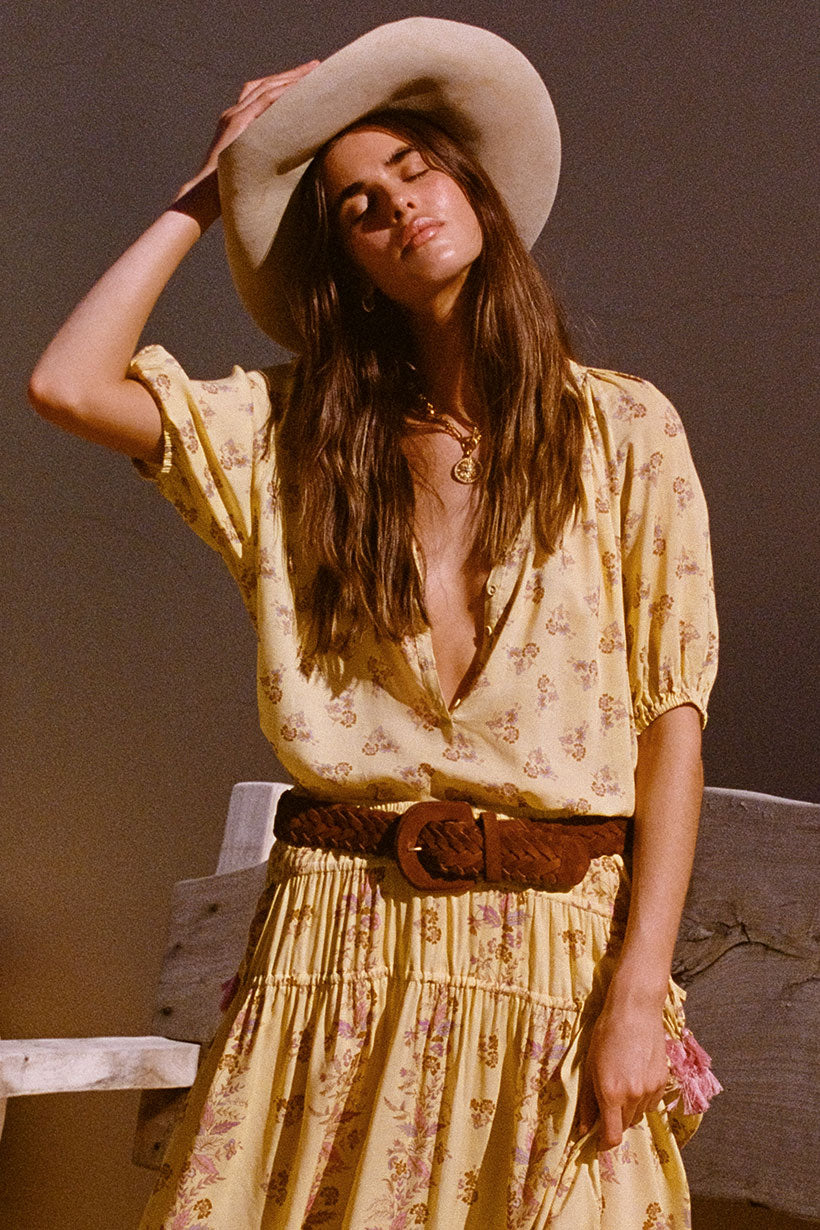 The Rebel Spirit Short Sleeve Blouse in Daffodil is crafted for the rebel romantics. A beloved shape, reimagined in a fresh feminine hue, effortlessly transcends seasons, making it a timeless addition to your wardrobe. Adorned with hand-drawn desert wildflower motifs, it pairs beautifully with the Rebel Spirit Tassel Maxi Skirt for a cohesive look or with denim for a touch of everyday glam. The fabric covered button down front and gathers throughout add a hint of elegance, making this blouse a versatile piece that channels both whimsy and sophistication.