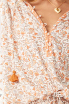 Our Sunshine Bandit Blouse in Desert Sage Is a beautiful paradox, combining intricate details with a breezy carefree silhouette. Our newest blouse includes a drawstring tie hem that can be left loose with the hem skimming the hips or pulled to the waist for a cropped option. Our blouse arrives in our hand painted print, a patchwork of signature florals, ditsy motifs and elevated placement borders. Exuding undone beauty, our blouse features a dropped shoulder, neck ties with hand made tassels and a button up front for styling versatility. This blouse is perfect to pair with denim and slides for an off duty look or with the Sunshine Bandit Wrap Skirt for a modern day bohemian goddess inspired ensemble.
